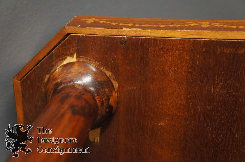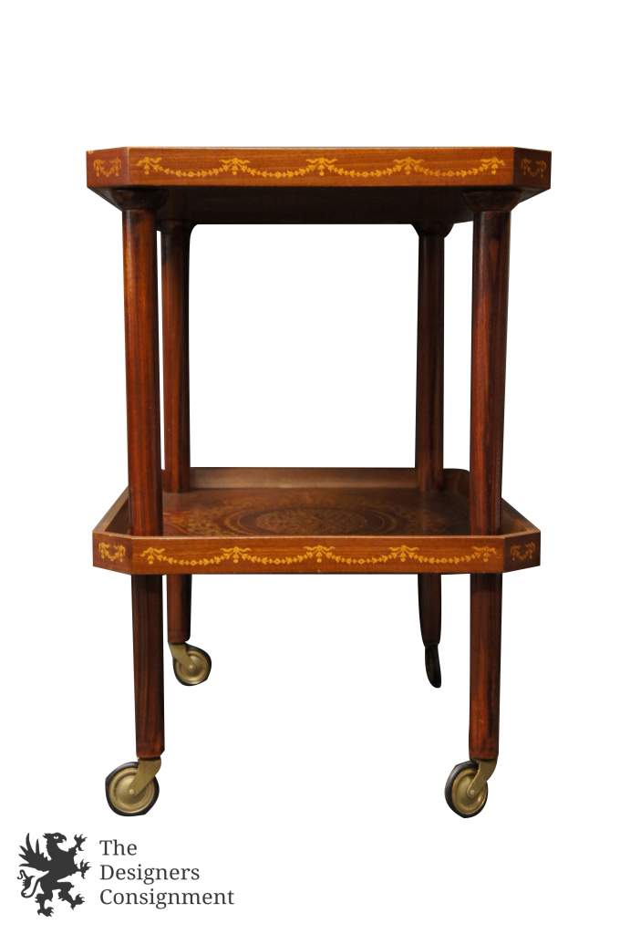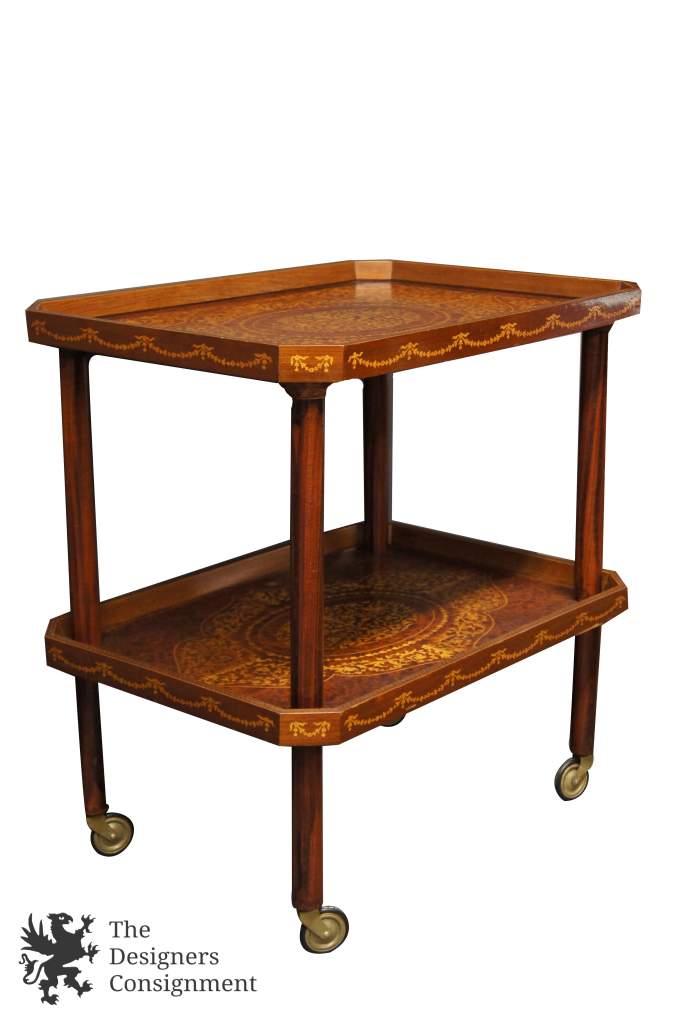 Here we have a gorgeous bar cart or trolley. The cart is not marked, however it was most likely made in Italy with French Styling. Made from beautiful Mahogany burled veneer with a filigree inlay showing birds, animals and cherubs in a garden/ floral setting. Ornate bird baths throughout. The cart is 2 tiere with large casters. An exquisite addition to any setting.