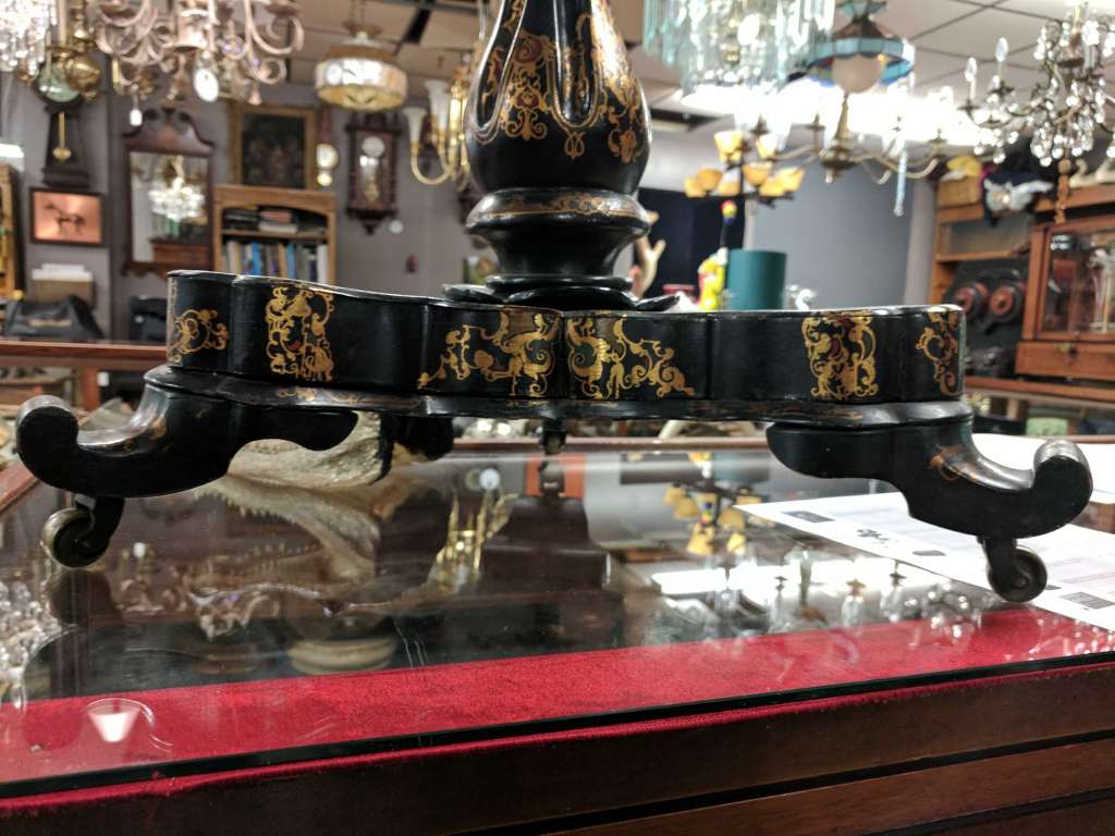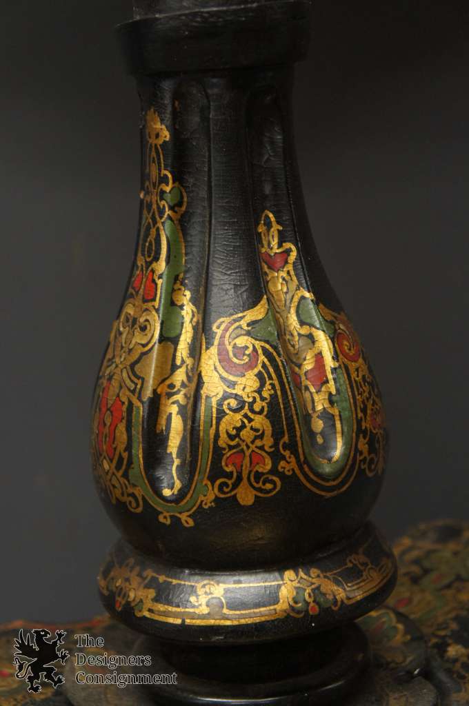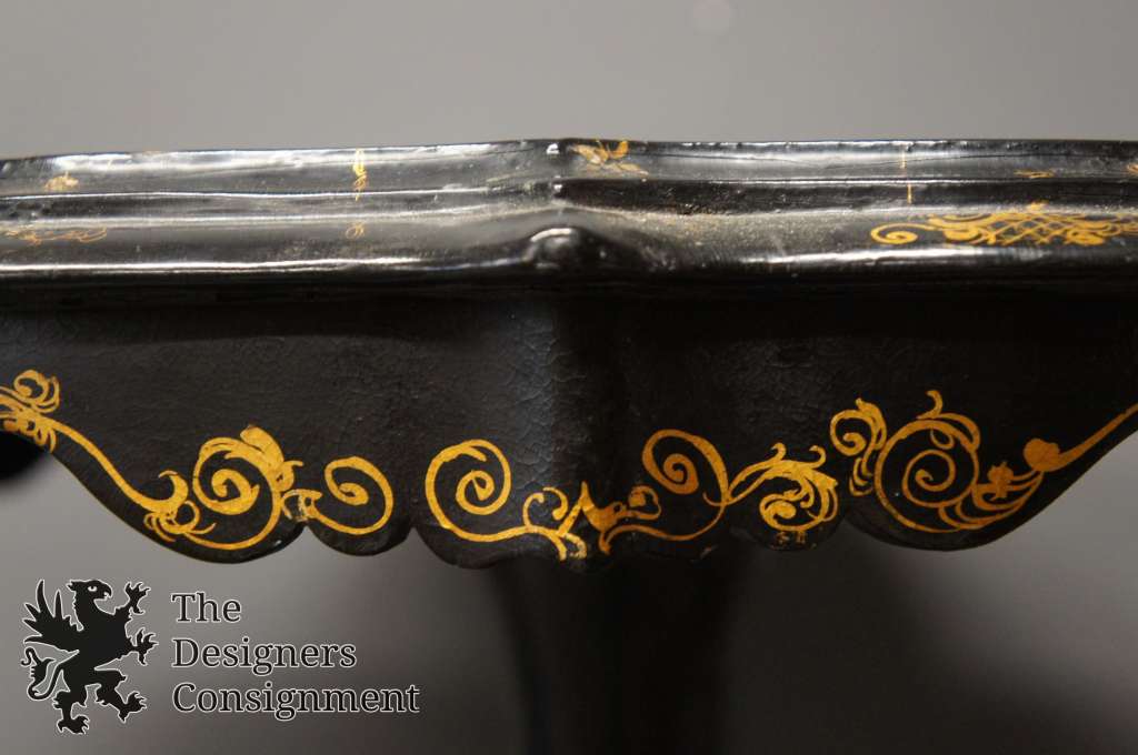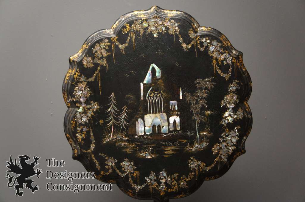 Offered for sale is a magnificent Victorian flip top table, circa 1860s. Features a scalloped top and papier mache finish in black lacquer with mother of pearl. The table is centered with a cathedral or temple in a landscape setting and decorated in hand painted gold accents. The perfect statement for any setting.