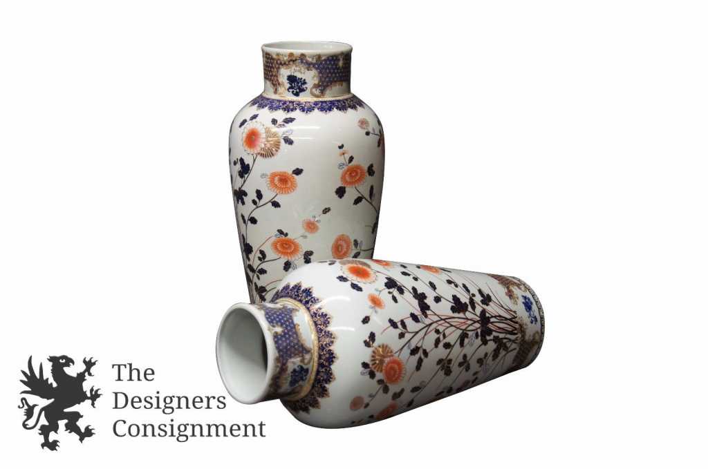 Exquisite pair of Meiji Period Japanese Hand Painted Palace Vases. Blue and Gold over white with red/orange flowers. A great addition to any collection.