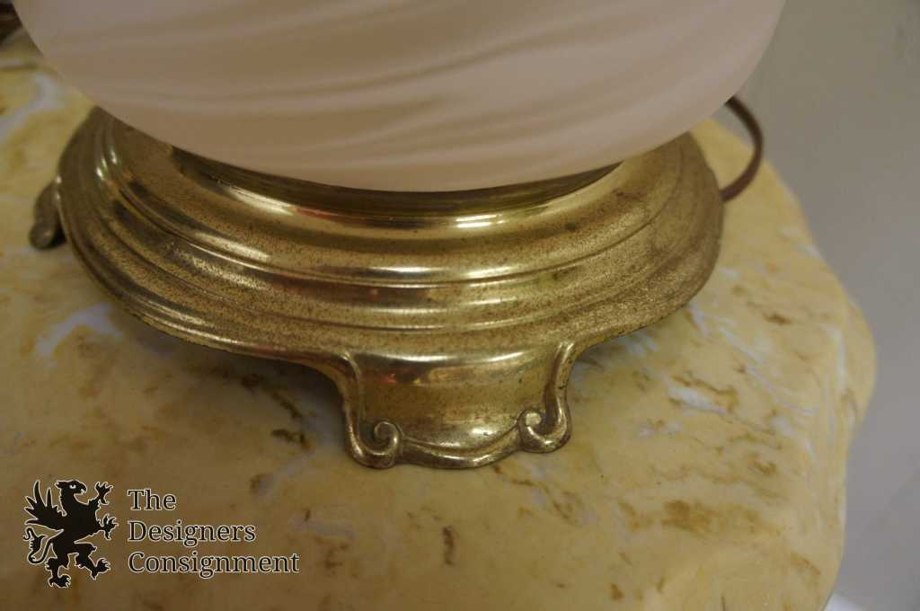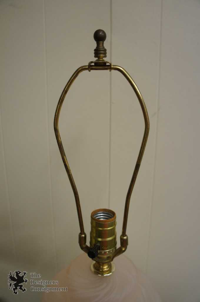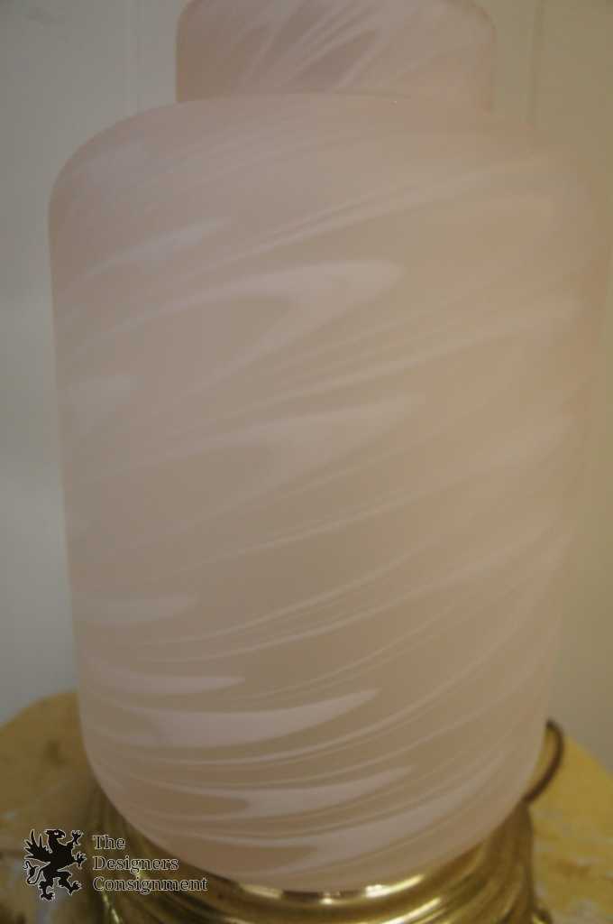 Circa 1980s lamp by Accurate Casting Company out of New York. Features an uplight and interior glass illuminating the pink satin glass center. Features a brass base. A perfect addition to any setting.