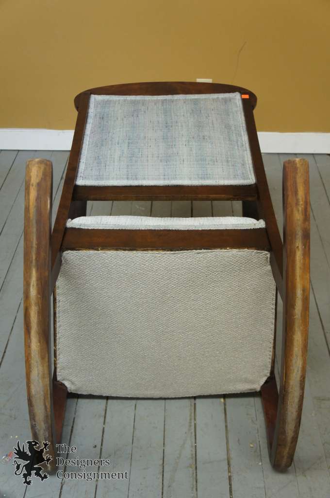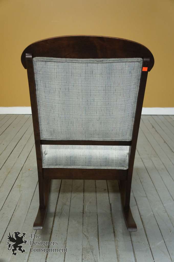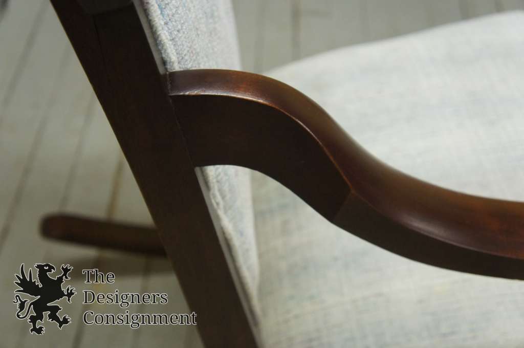 Early 20th Century Mahogany Rocker, upholstered in a light blue. Features a mix of Queen Anne and Victorian styling. Sleek lines with a smooth finish. Parlor set available and pictured below. This includes the rocker, a settee, 2 arm chairs and agentlemanchair with ottoman.