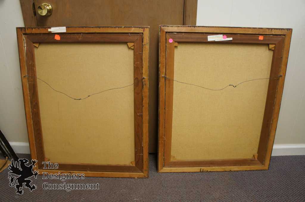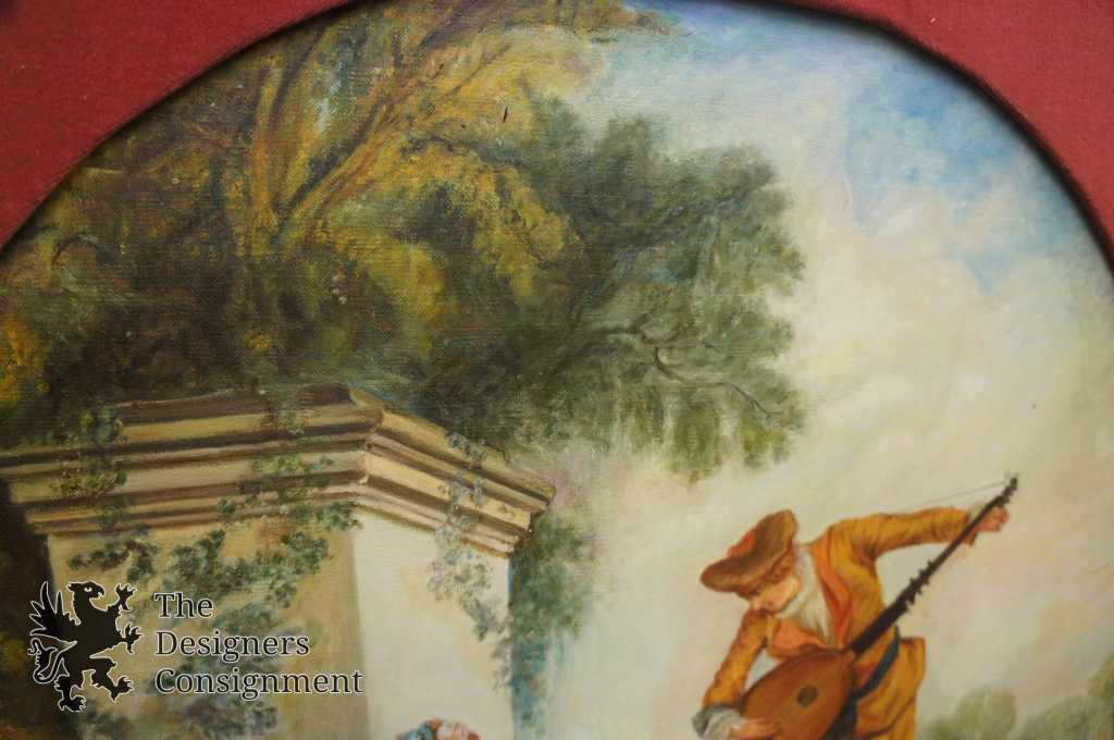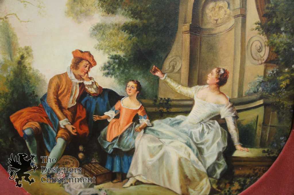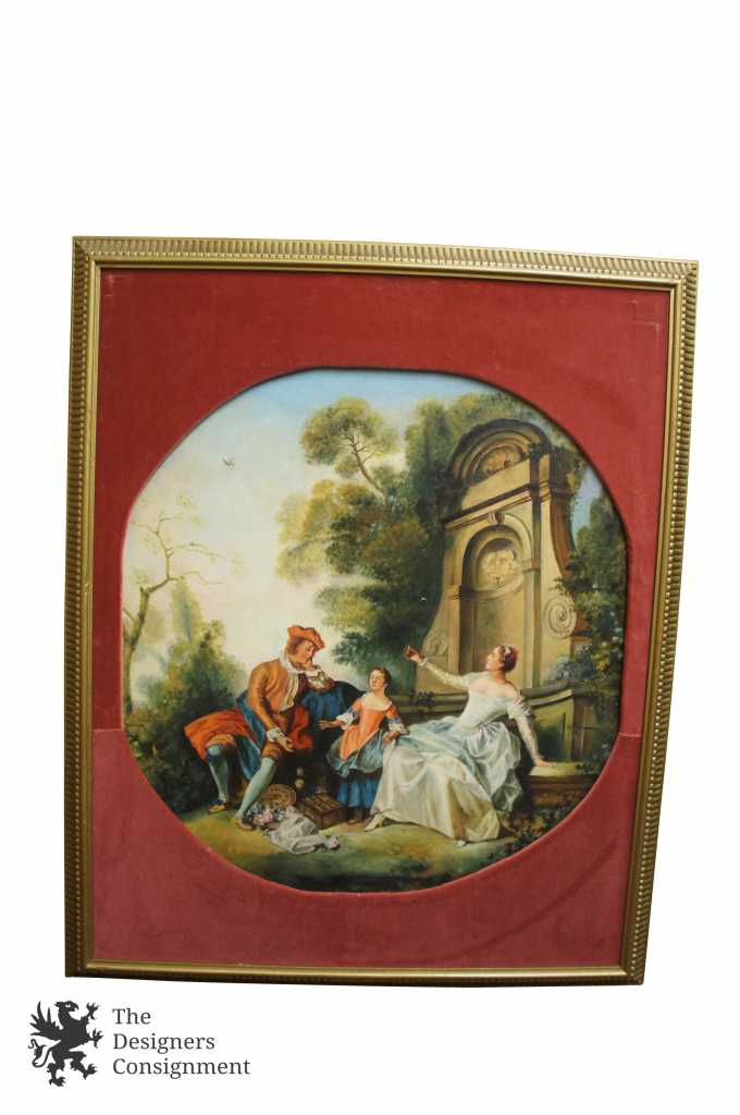 A gorgeous pair of 19th century French School oil paintings. Featured are a husband, wife and daughter in the gardens of a glorious estate. In one scene they are having a picnic by the fountain, and in the other the father is playing music to the girls in the garden. Painted on canvas with velvet mat and gold frame. A neat addition to any setting.