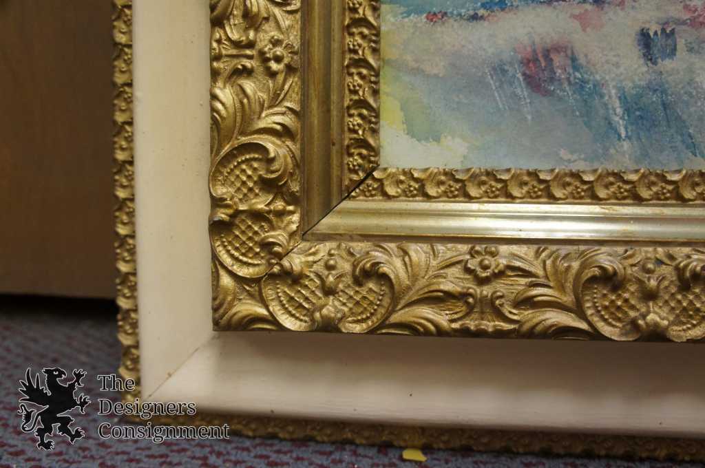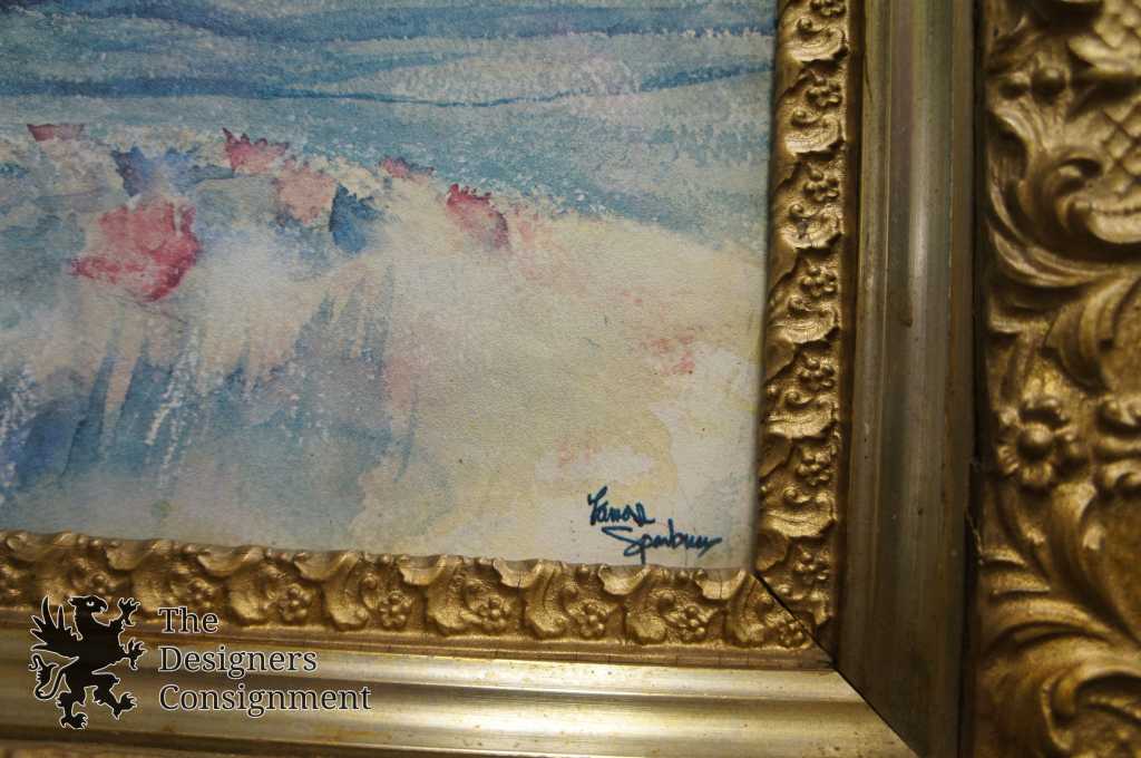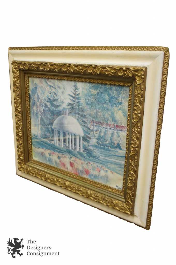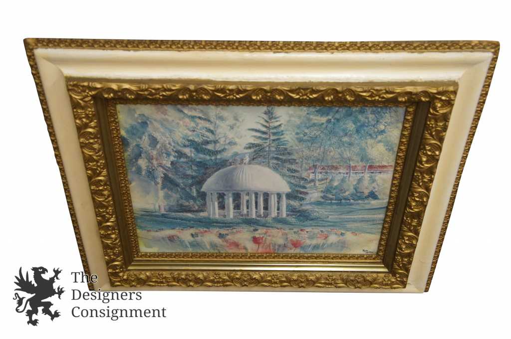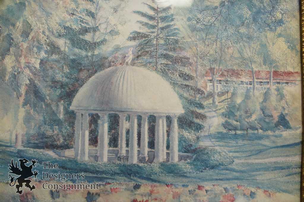 A beautiful signed print showing a garden with a large Greek style Pavilion. There is a statue mounted on the domed top. This piece is signed in the lower right corner. The frame is antique with raised gold trim. A fantastic addition to any setting.