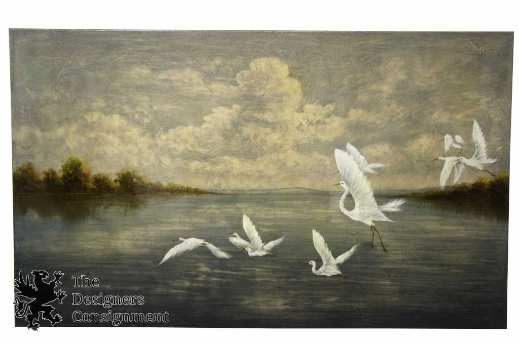 Vintage Oil on Canvas Painting Landscape Lake with White Cranes Water Birds 232735288816