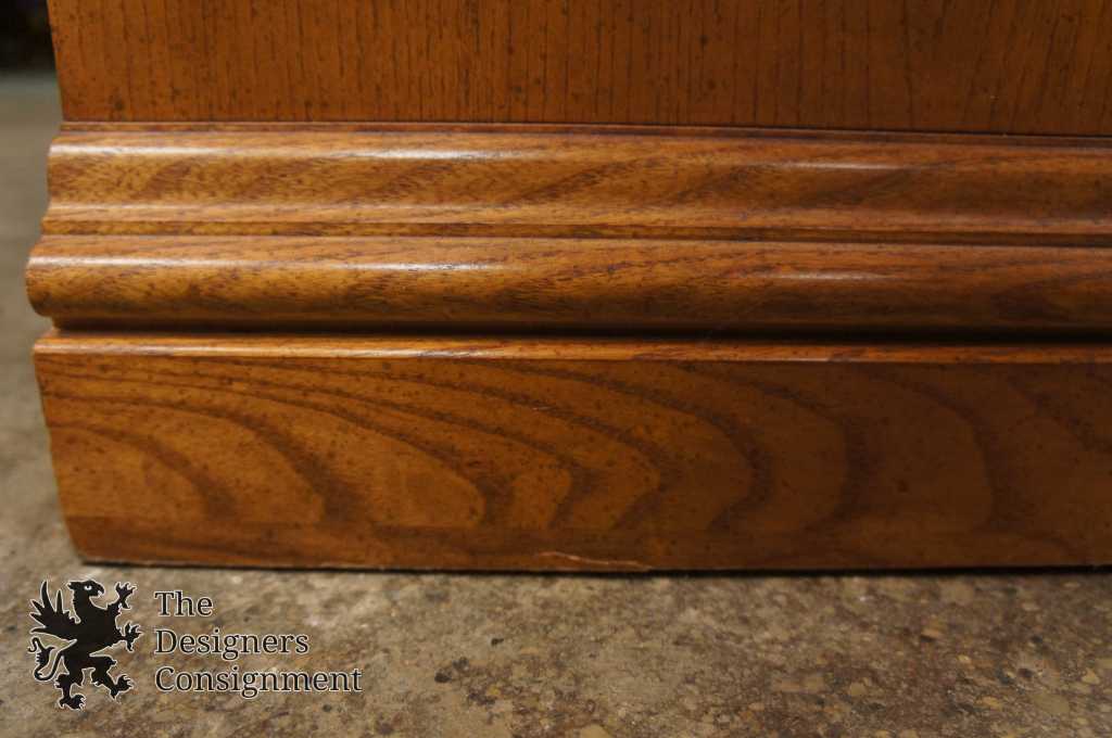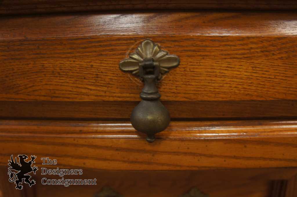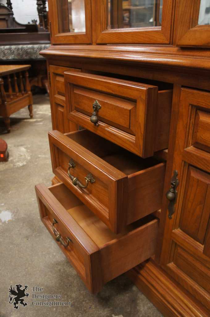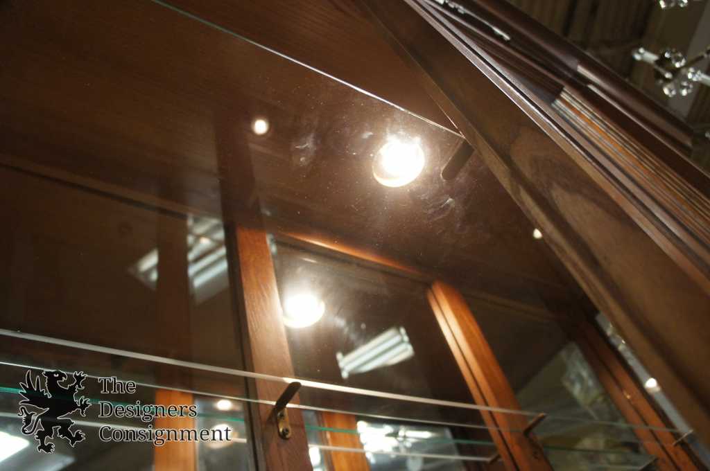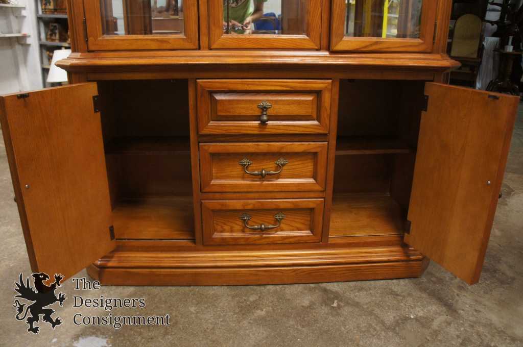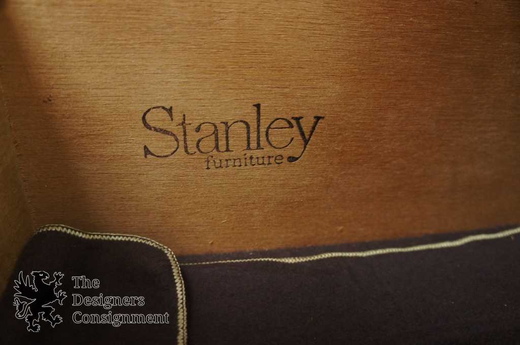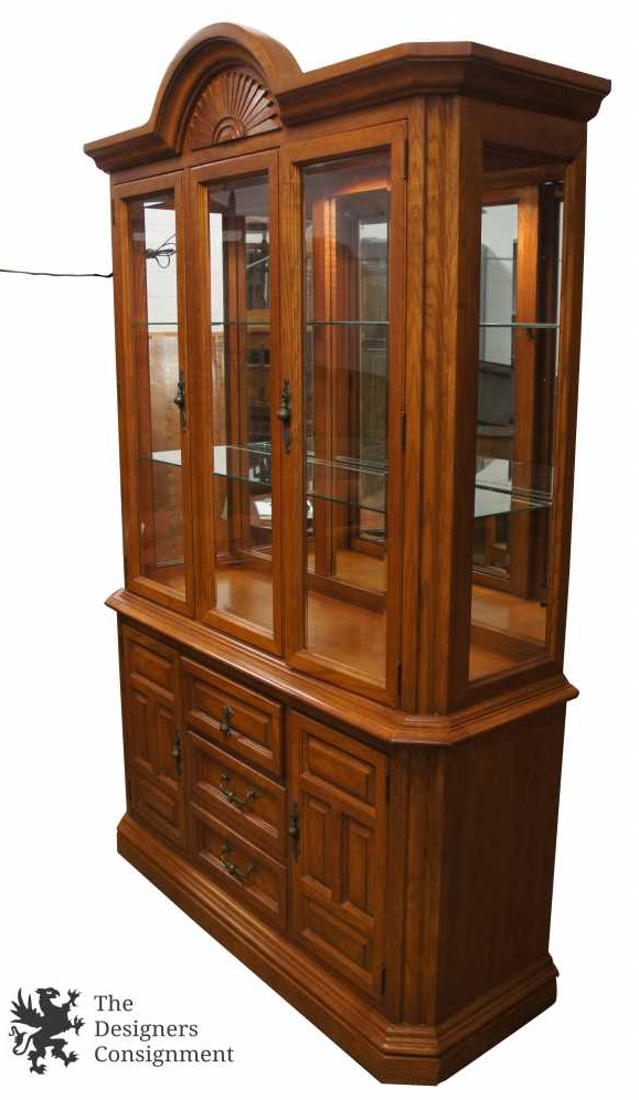 Stanley Furniture's Neoclassical line. Illuminated at the top with 2 interior shelves. Lower portion features three centrally located drawers flanked by side cabinets with shelves. Top drawer has silverware cloth. A beautiful overall design with cut corners and an arched top with sunburst accent at the center. Made from Ash