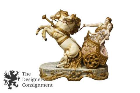 An elegant bisque Roman Horse & Chariot by Capodimonte. Hand-painted with gold detail. Meticulously crafted all the way down to the figural lion head that comes off the chariot that the horses are mounted to. Marked Italy on the base. A great piece for any collection.