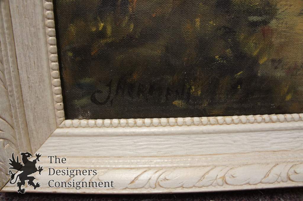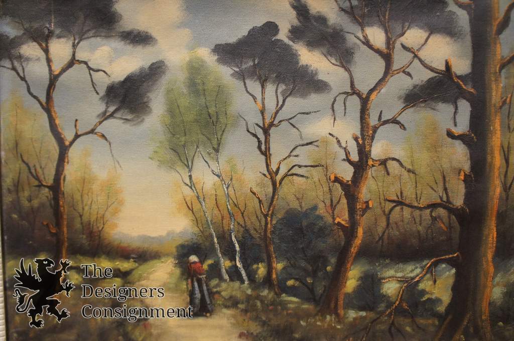 20th Century painting by Dutch artist J.Hermens. Features is a woodland landscape showing a peasant walking off in the distance. Signed on canvas lower right. Framed in wood with white finish.