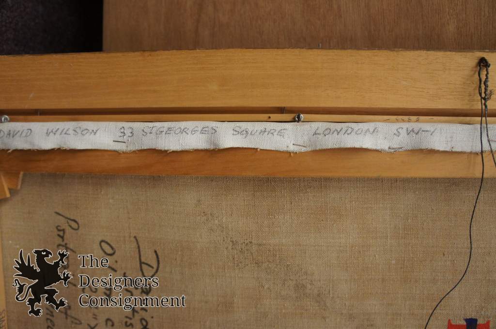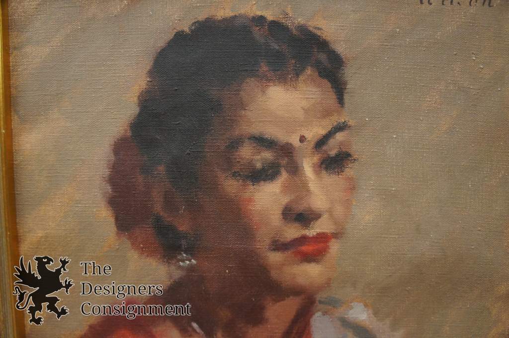 Beautiful oil portrait by David Wilson. David was known for his portraits. Another example and auction record can be seen below. This piece features a noble woman by the name of Shrimati Uma Devi who lived from 1876-1936. Exquisitelines and color. Signed in the upper right. This paintingis extensively marked up on the back, showing where it came from or possibly exhibited in St Georges Square London Sw-1. Bio down below.