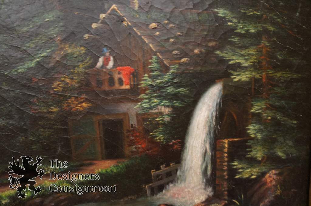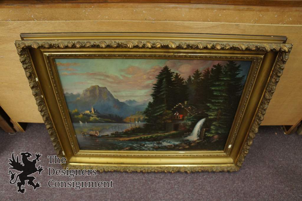 A beautiful sunset landscape from the Netherlands c. 1891. Waterwheel can be seen along the right next to a cabin in the woods. A gentleman can be seen lake side in his boat. In the distance is a castle orfortress placed before a ridge of mountains. Exquisite color and detail. Signed along the lower left. The signature is too faint to discern, but the year 1891 is visible. Painted on canvas with a heavily gilt frame.