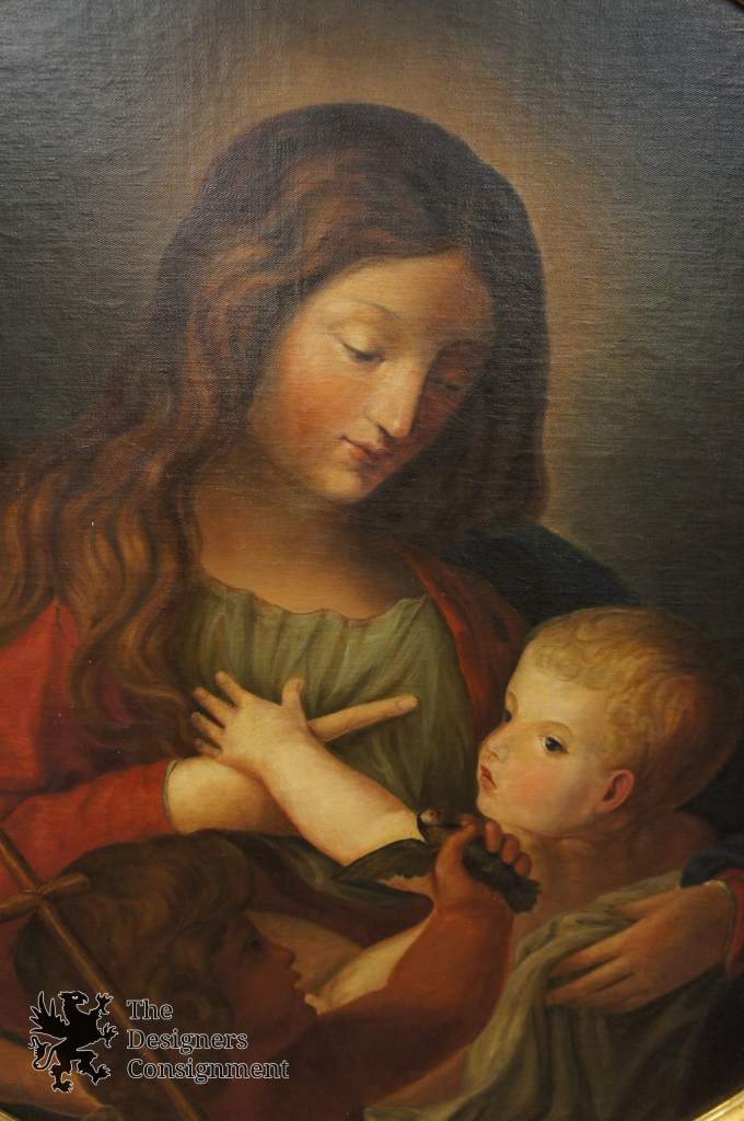 A very fine 19th century depiction of Madonna, infant and John the Baptist. Massive circular oil on canvas with exceptional detail in stately gold leaf frame. Due to its size this piece will be hand delivered via White Glove Service.