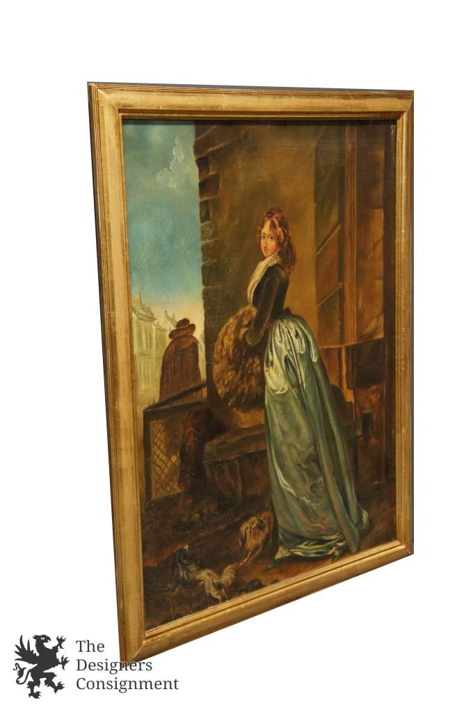 A beautiful 19th century oil painting. Purchased in the Netherlands. The piece is signed in the lower left by a European artist. Depicts a woman standing outside informal ware. A brick building can be seen along the right near a shadowy figure in the background. Framed in a wood frame and painted gold.