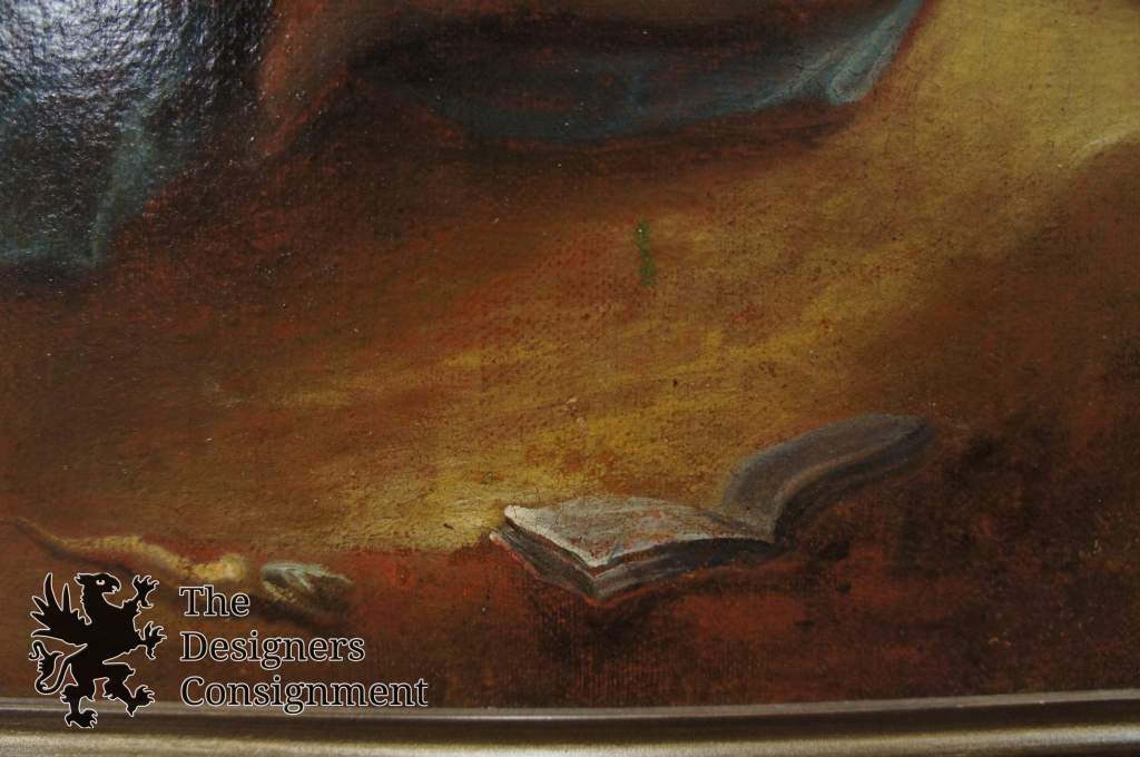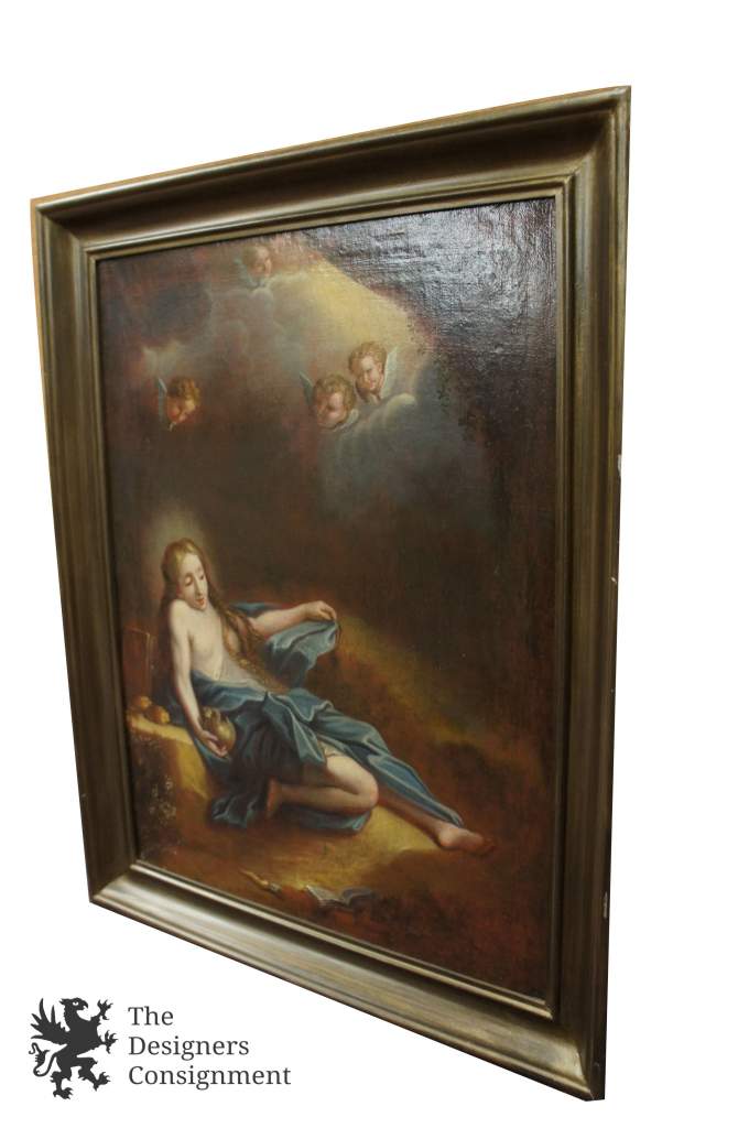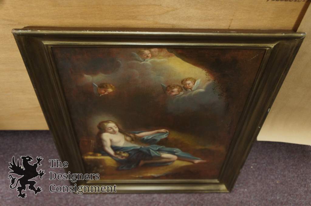 18th century oil painting on canvas. Featured is a Nymph lounging while eating. 4 Angels can be seen above amongst the cloudy sky of purple hues. Below the Nymph there are flowers, and a book appears to be behind her. A newer 20th century framed finished in dark gold. There is writing on the top frame of the canvas, but I cannot make out the name.