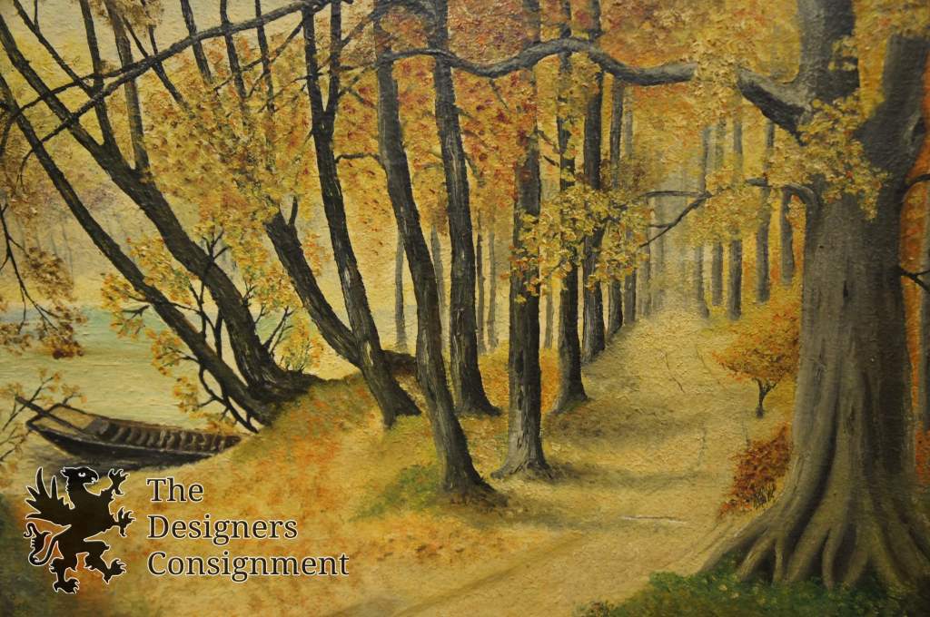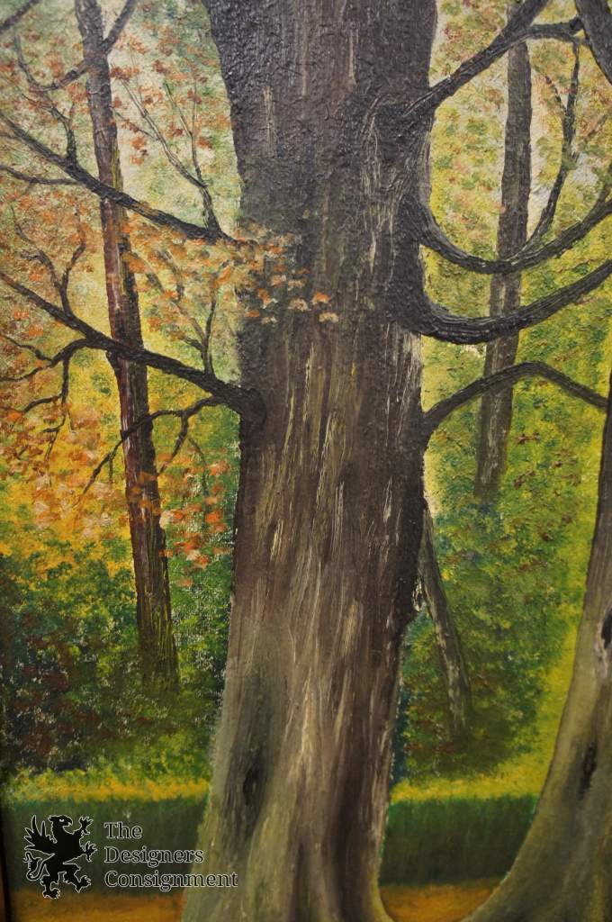 Gorgeous pair of 20th century oil painting by R. Dugardin. A meticulous fall woodland setting with great color. both show a pathway through the woods. One looking down the pathway of trees, while the other is perpendicular to the road showing a fence and trail in the distance. Framed in wood with a grooved black boarder making these pieces really stand out. Perfect fort any setting.