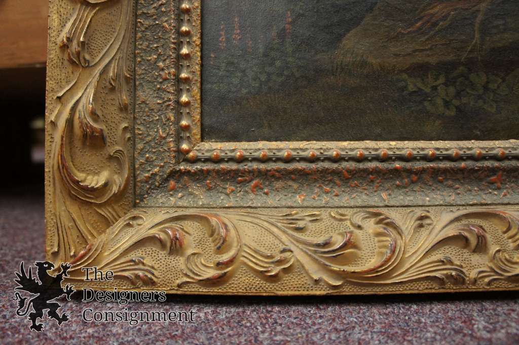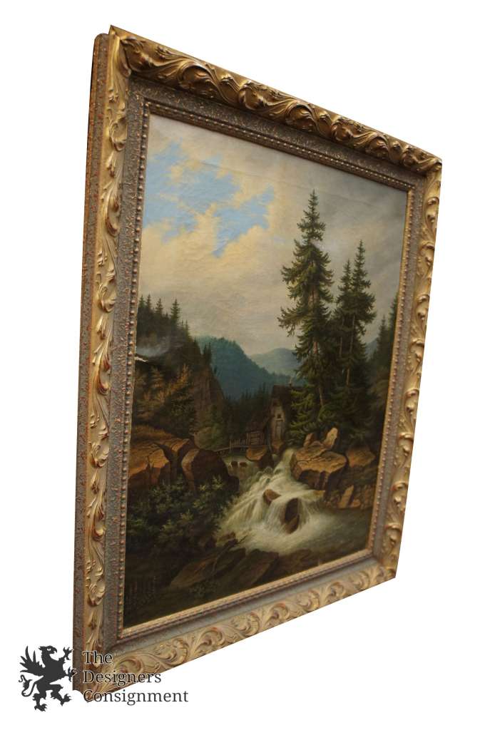 A beautiful landscape set in Switzerland. Featured is a country home with water mill along the river. Water can be seen crashing past the boulders as it pours down stream. 20th century frame in French styling rubbed in a distressed gold with floral detail. Back of the canvas shows discoloration and age.