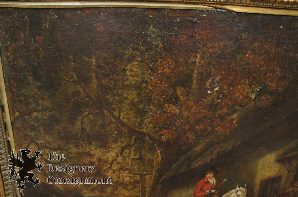 Good Vintage Condition - Splits in Frame; Repairs; Wear to Gesso. Canvas is dirty, and could use a cleaning. Some paint Flaking.