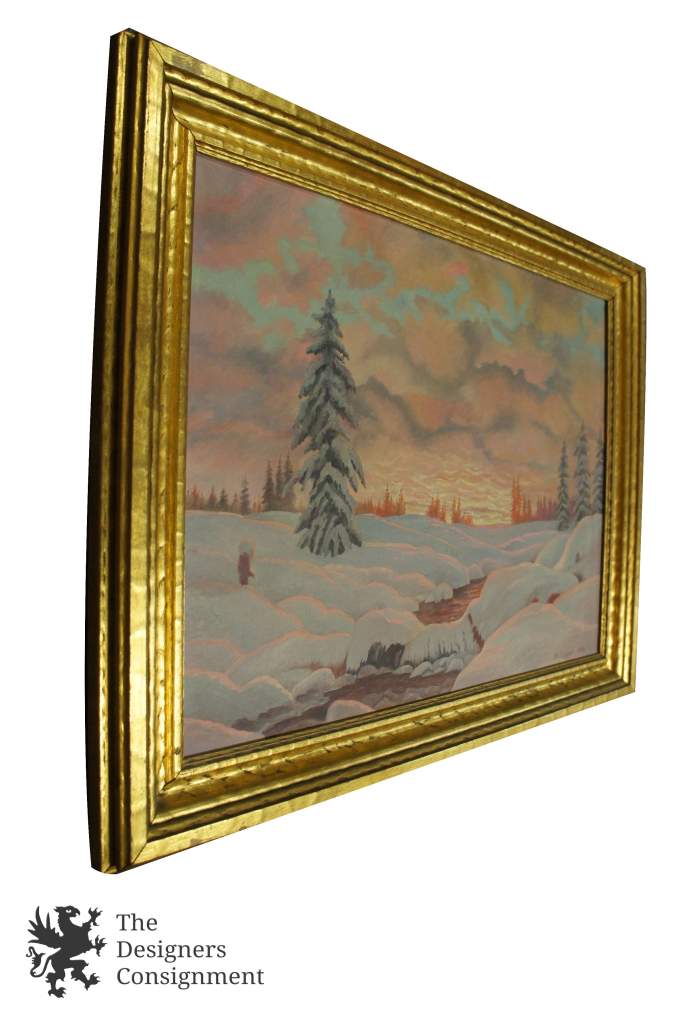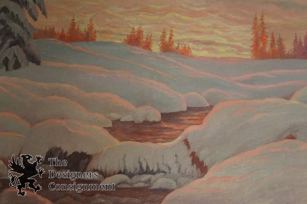 A neat early 20th Century Painting by one Mrs ML Bigger. Features a sunset scene on a winter day near a flowing river. Evergreens can be seen in the distance amongst pink clouds. Framed in Gold, and signed on the bottom right.