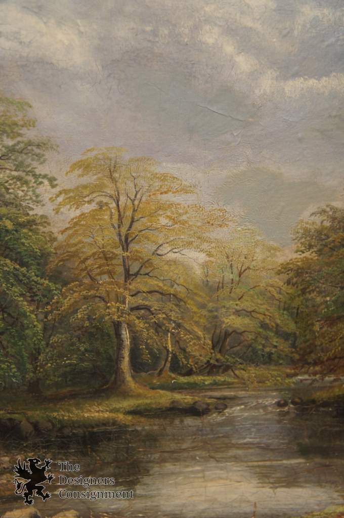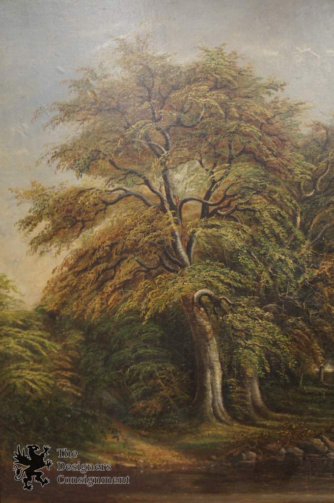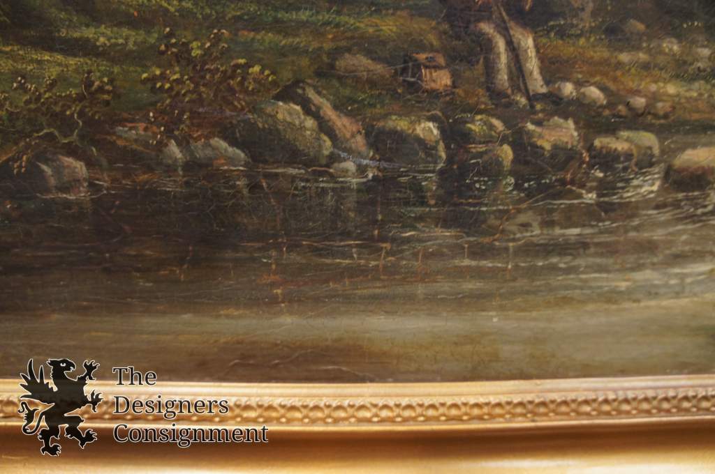 A Gorgeous 19th century oil landscape. Featured is a man fishing along the riverside. The trees are remarkably detailed with vivid green and intricacies. The canvas shows age on the front through crazing as well as it has darkened through the years along the back. The frame is solid wood with gesso molding along the front in a floral motif. A great conversation piece for any setting.