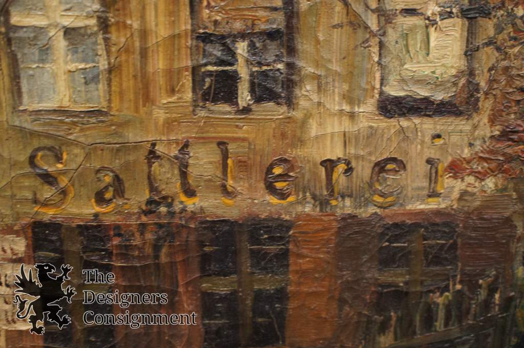 A beautiful cityscape oil painting on canvas with figures. Circa 1850s. The building in the distance says Sattlerei, which means saddlery and harness goods. Translated from German to English. The canvas is heavily aged with hardened paint, crazing and splitting. Framed in Gold-toned frame.