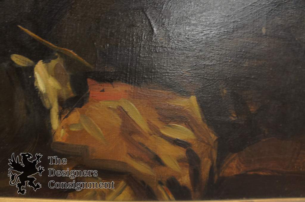 19th Century European Oil Painting. Featured is a laughing peasant with raven over shoulder. The piece features heavy brush strokes giving off a great look. Frame is wood with gold finish in gesso. If you look above the raven there is some writing (seen in the 5th + 6th Photo) we cannot make it out. There is a sticker on the back of the frame that says Tilley.