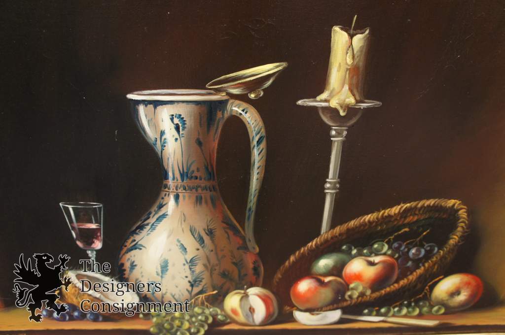 Helmut Baumgart is active/lives in Germany.Helmut Baumgart is known for painting. Born in 1935. The still life is life like in detail. The pitcher, fruit, wine and candleare perfectlyplaced between the arcade seen in the background. Signed in the bottom left.