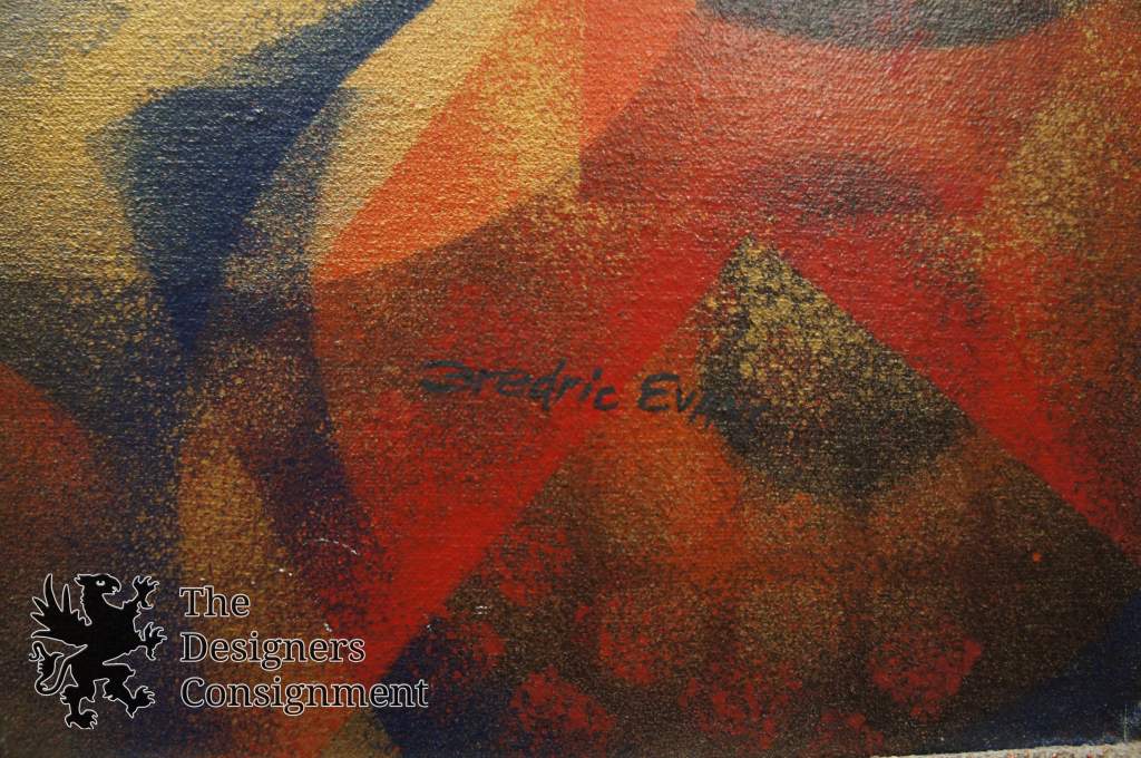 Elegant Geometric Oil Painting on Canvas. Circa 1970's. Signed by Fredric Evans. The painting is framed in gold tone with floral accents.