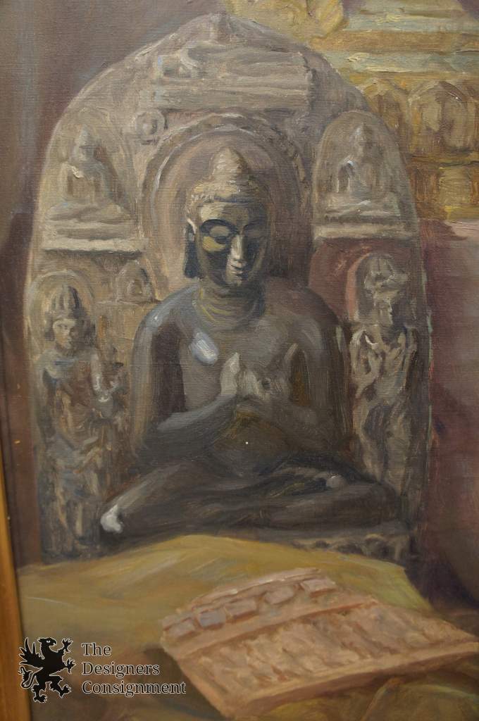 Here we have an amazing early 20th century work from Hugo from his time spent in India. The canvas shows age and character. Depicts a palace still life scene filled with royal items. A Gold Crown can be seen in the middle beside a Maharaja Meditating Buddha. In the background Hare high relief gold plaques as well as a bird statue. An authentic piece rich in color that will make a great addition to your collection. In the last photo an auction result can be seen of his work. The piece is smaller, but indicative of the character of his Artwork.