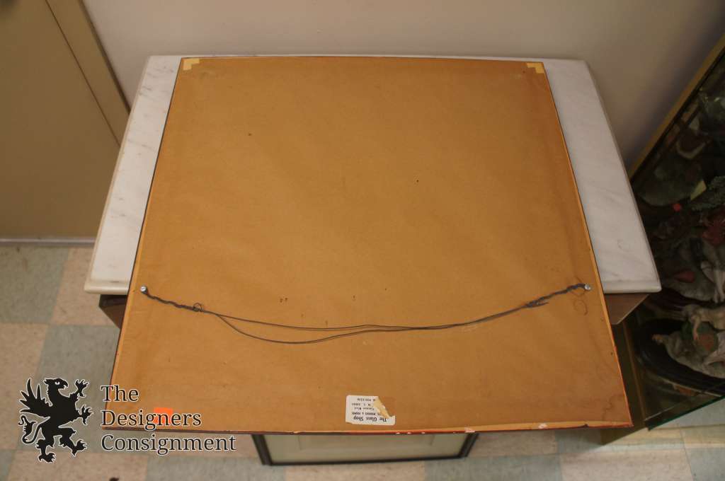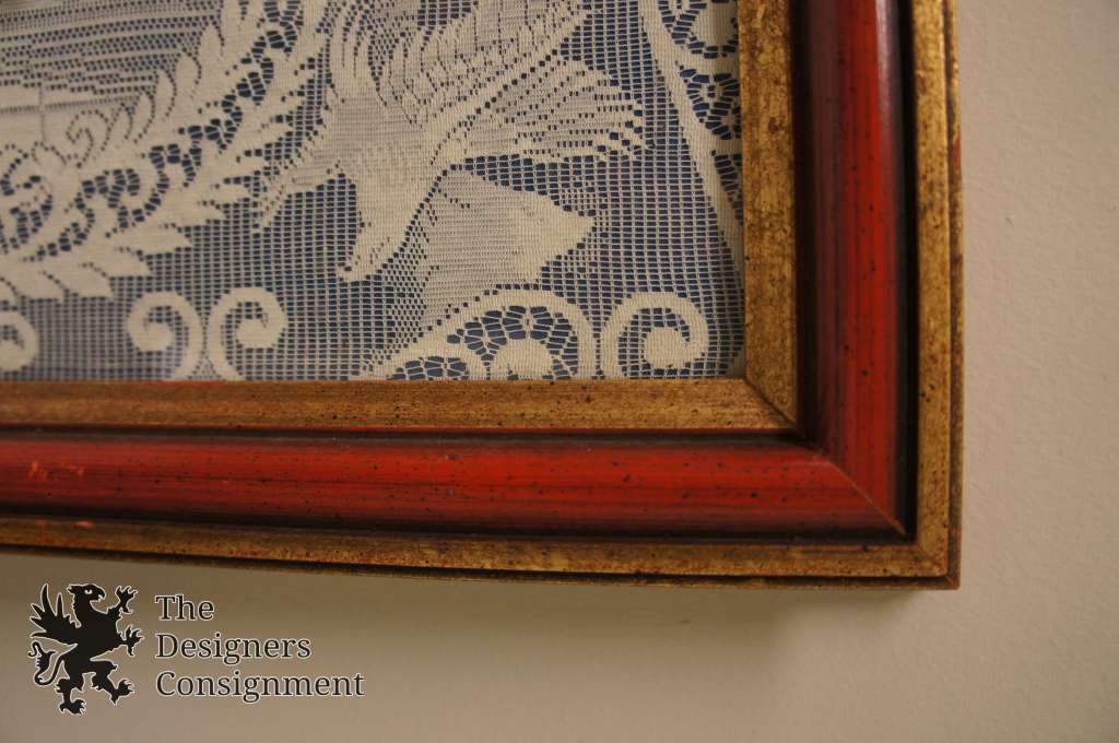 Beautifully hand crocheted scene. Professionally framed on a blue backing behind glass.