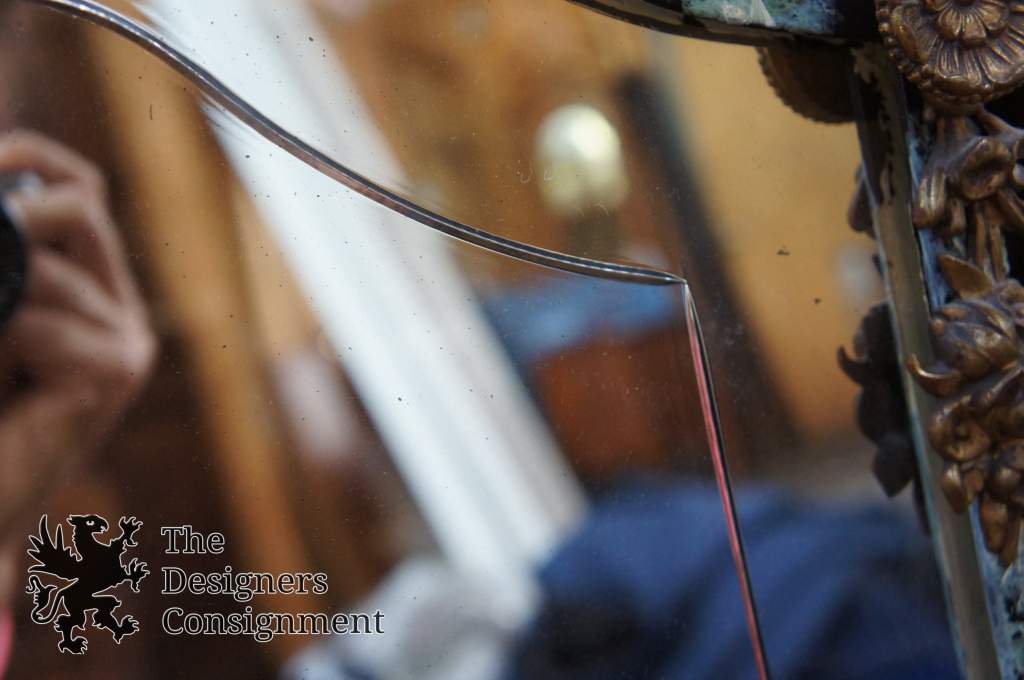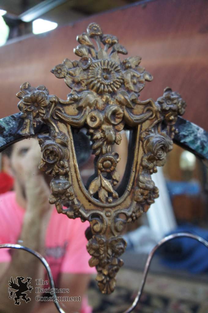 A beautifully designed mirror. Features a metal frame with gilt bronze medallions and floral trim. The mirror itself is engraved with a border or trim that frames it neatly. A nicely weighted piece that will look great in any setting.