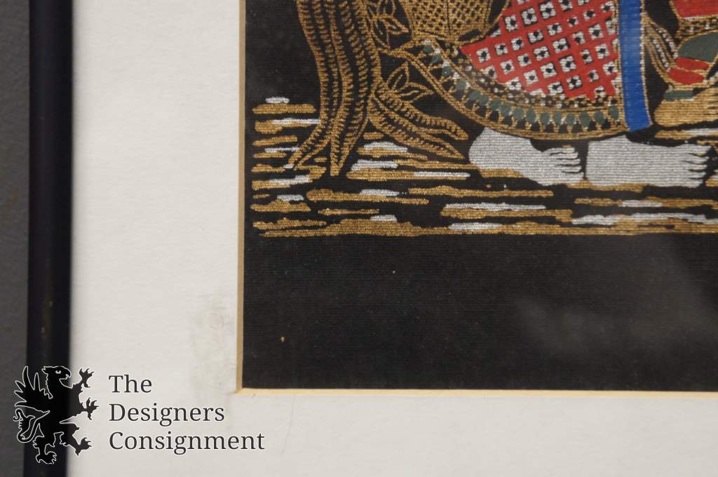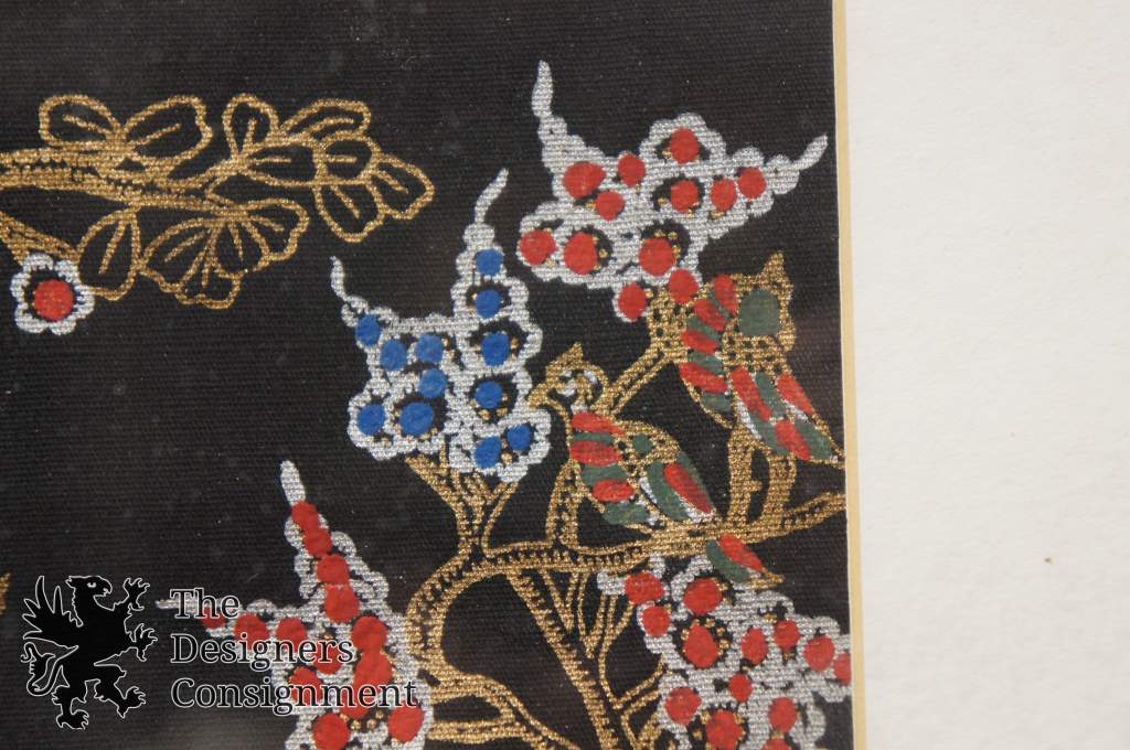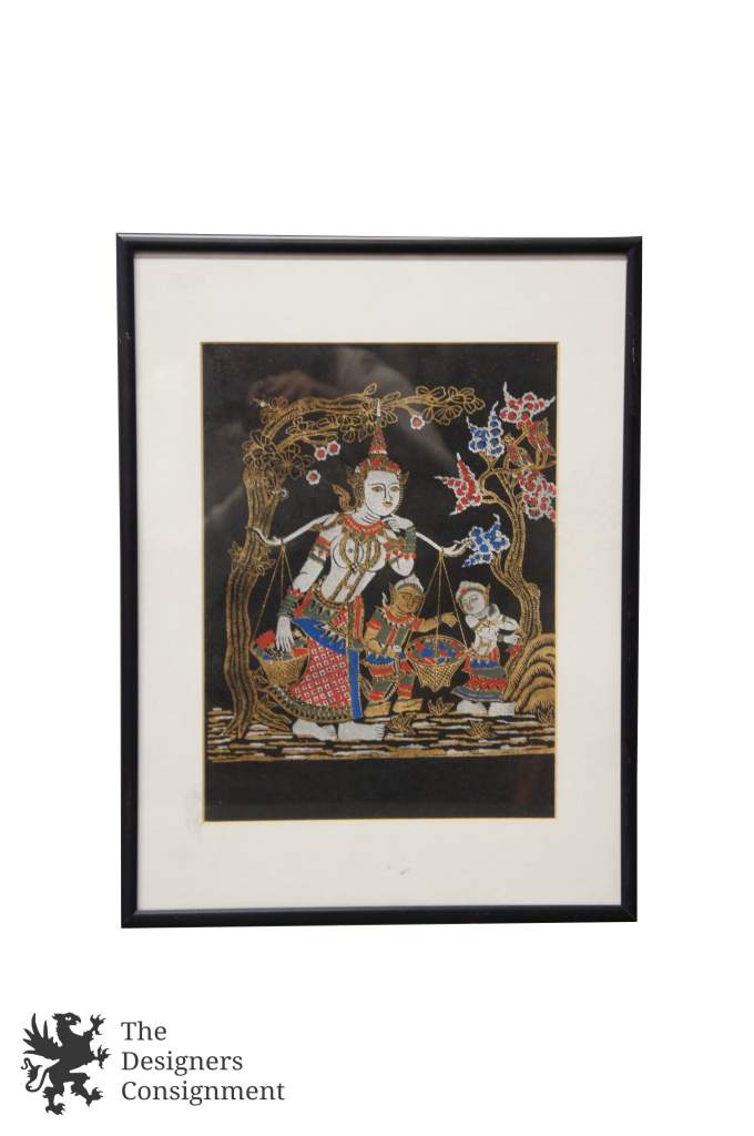 A beautiful linen painted tapestry. Features a Tibetan Harvest scene. The main figure can be scene in nude carrying a yoke on shoulders while the others are picking berries.