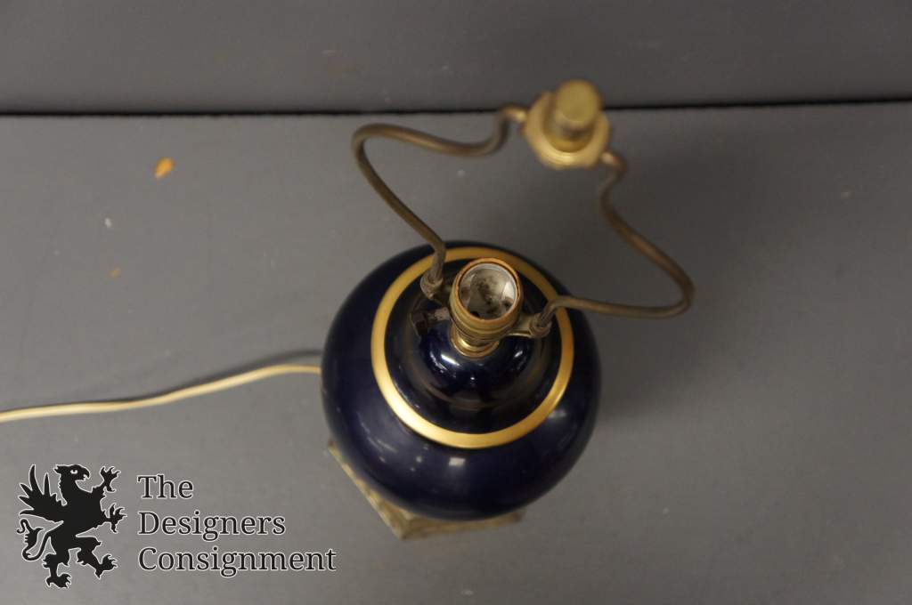 A truly unique designer accent lamp. At the center is a blue ginger jar with gold accents. The base is brass with a webbed pedestal that the lamp sits on. Greek key design throughout. Made from ceramic/ porcelain with a brass base.