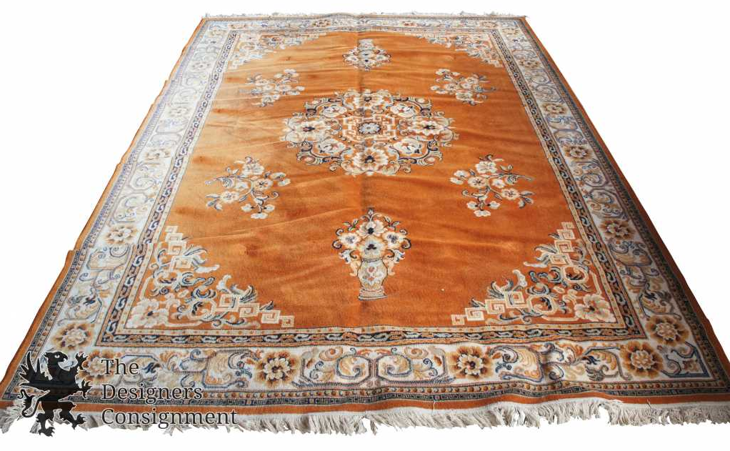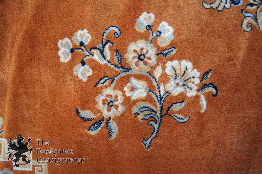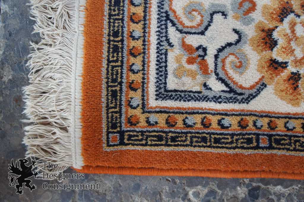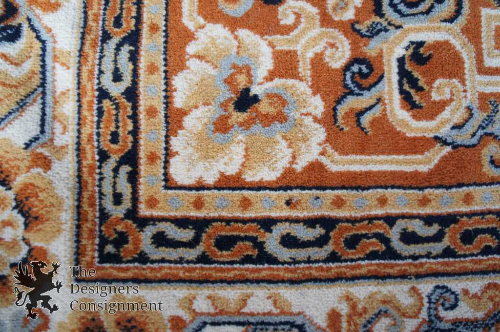 Traditional Oriental design. Orange, blue and white with geometric floral pattern.
