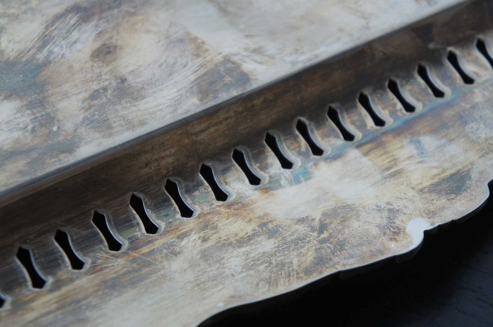 Extra large Birmingham Silver Company silverplated (silver on copper) butler tea tray or serving platter. Circa 1960s Features a scalloped floral and grape vine design with an engraved floral surface, reticulated border with handles and footed base. Two available, sold separately.
