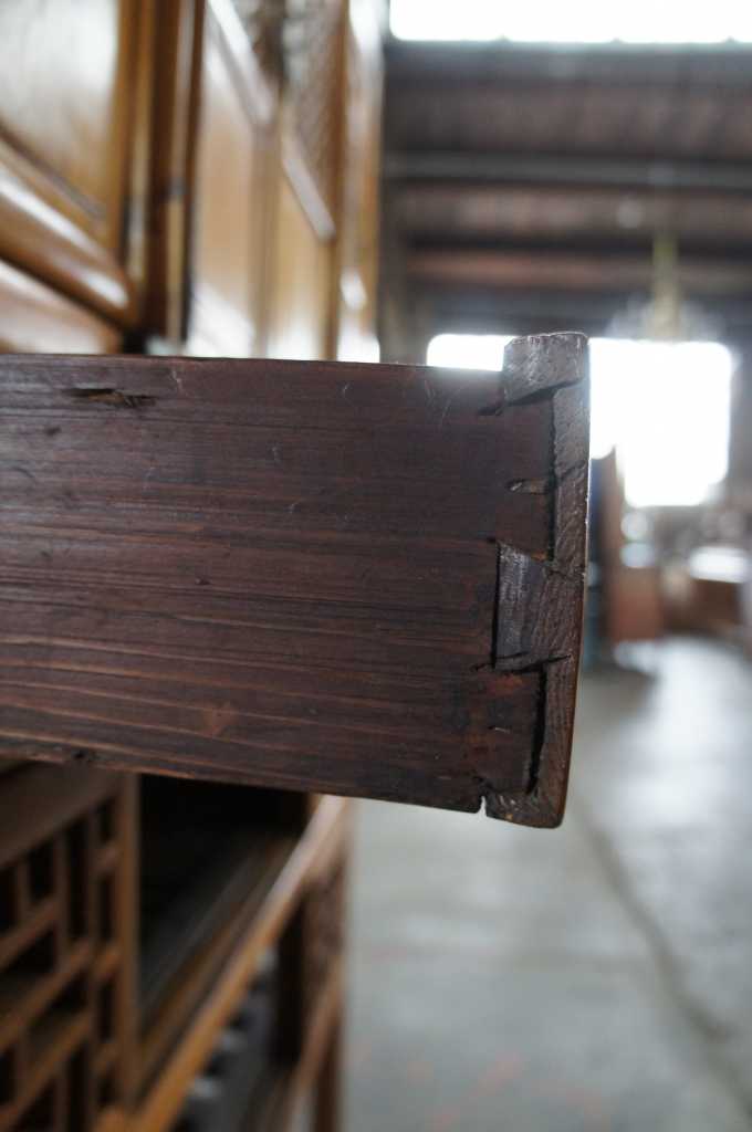 A gorgeous hand crafted Chinese Wedding Cabinet. Made from Elm with intricate detail. Features 3 drawers, adjustable lower panels and removable top doors. If you look closely you can see the piece is joined with dove-tails. A great addition to any space.