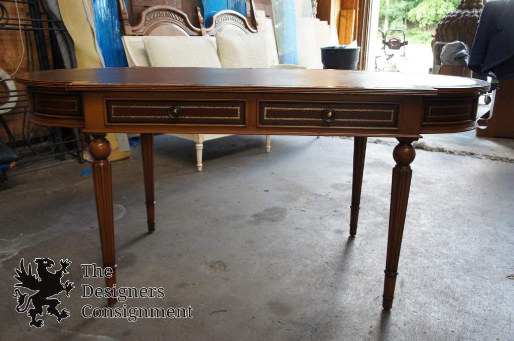 Features gold towle accents framing the leather, brass hardware and spindled legs.