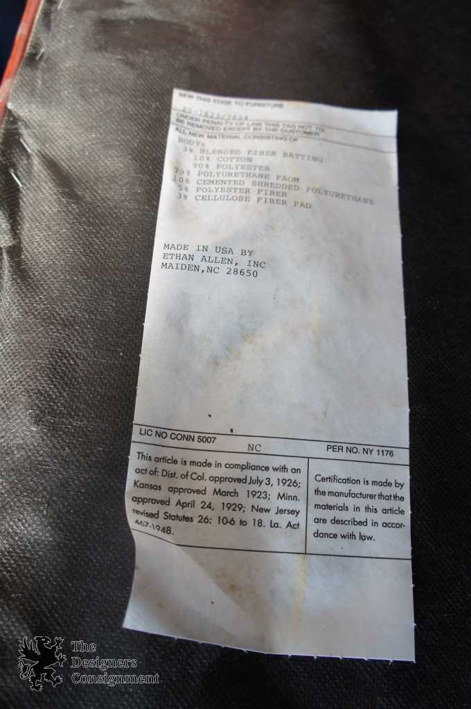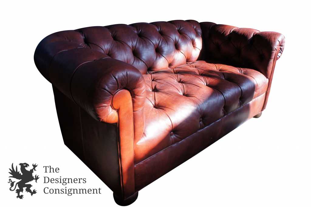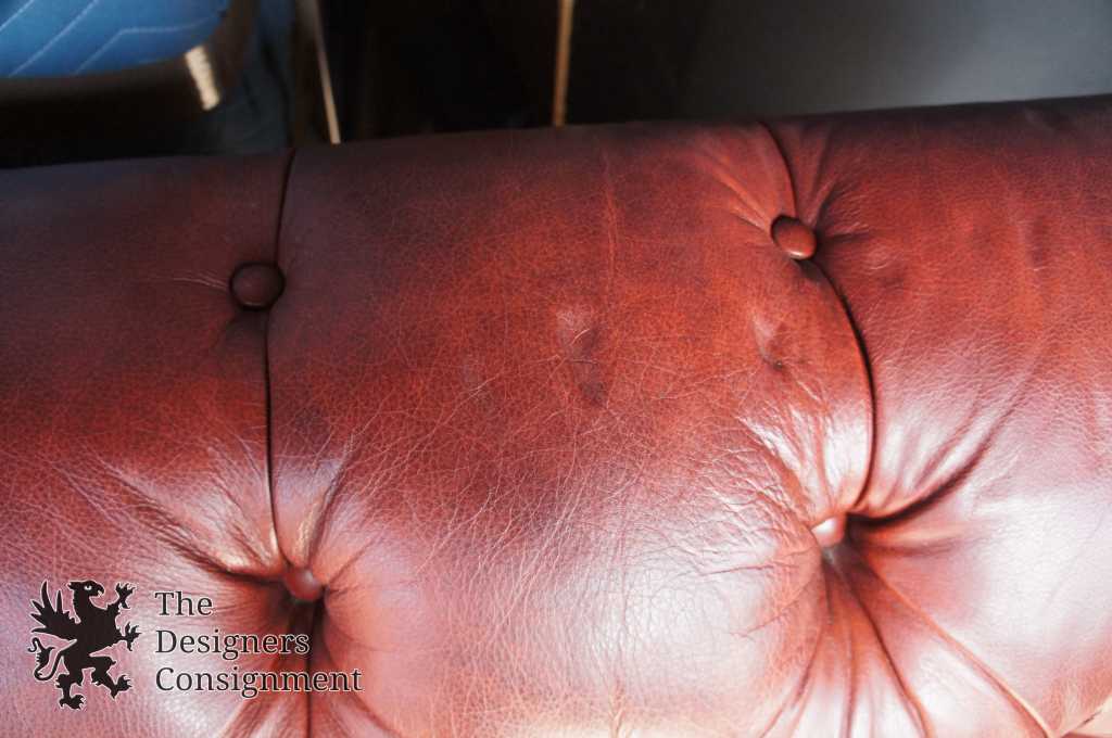 An exquisite example of the iconic Chesterfield sofa by Ethan Allen. Wrapped in red leather with heavy tufting and Mahogany bun feet.