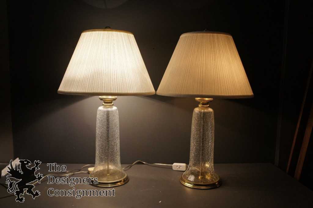 This pair of crackled glass lamps by Chapman have double sockets, dimmers on the cords and sit on brass bases. In working condition. Retailed for ($9-1000)