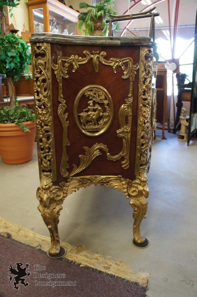 Circa 1920s Rosewood Carved Chest. Features Gilt Bronze mounted hardware with hunt scenes showing figures riding animals. The legs are magnificently detailed with rams heads The top is 1 1/2" thick Green Marble with a beautifully cut edge. Interior is locking with a shelve. A magnificent piece that will add grandeur to any space. Matching cabinet also available, slightly smaller in black.