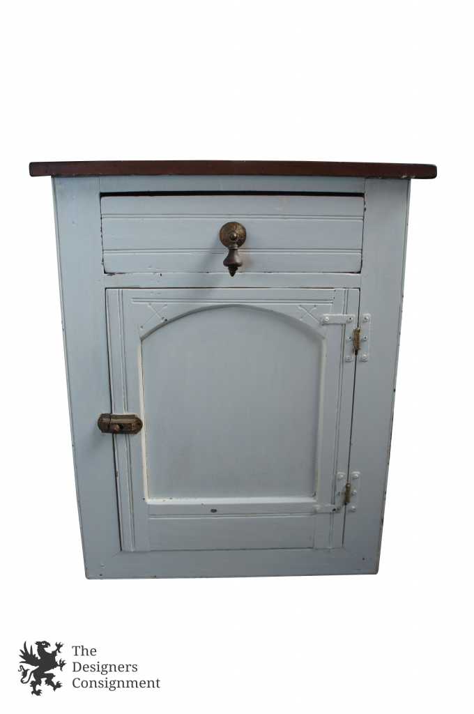 Good Antique Condition - The cabinet has a distressed top showing some marking and stains. The body was painted white at a later day. Lowe back right side panel has been chipped off at some point in the past. Can be seen in the second to last photo. Casters also added towards the middle of the century