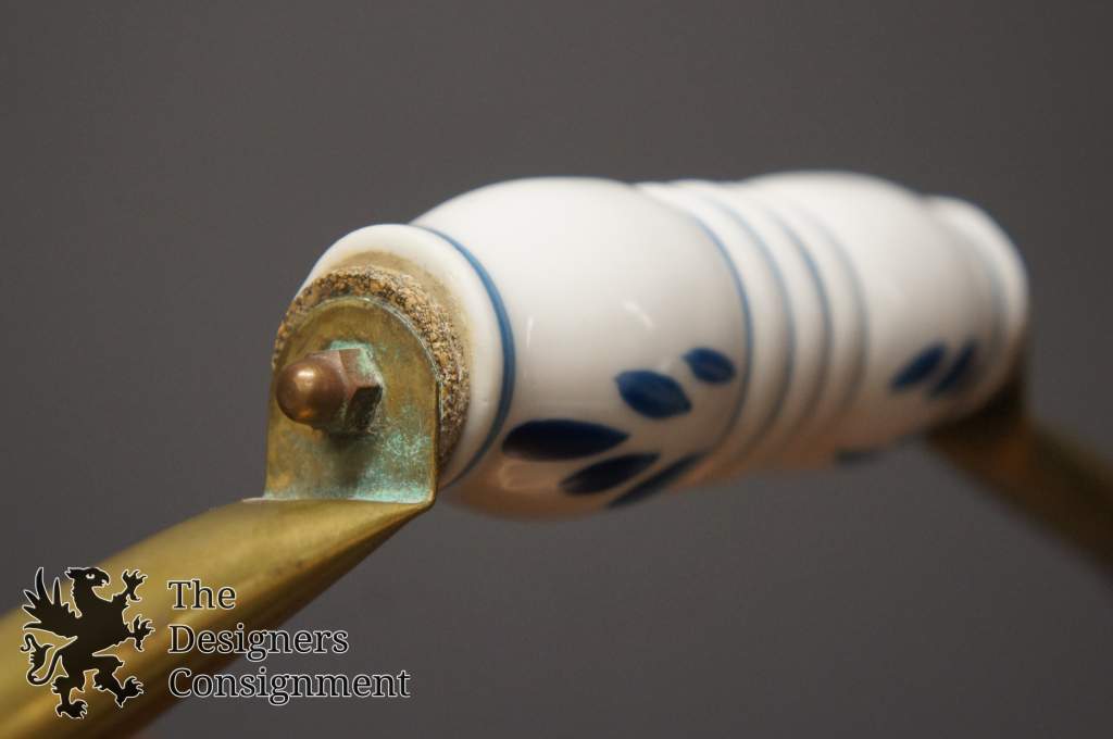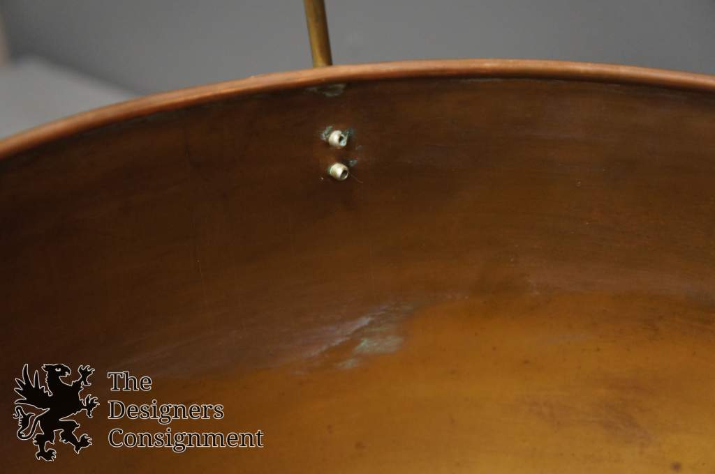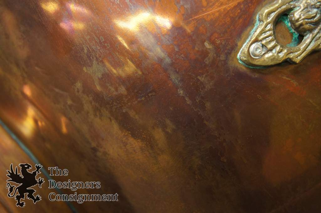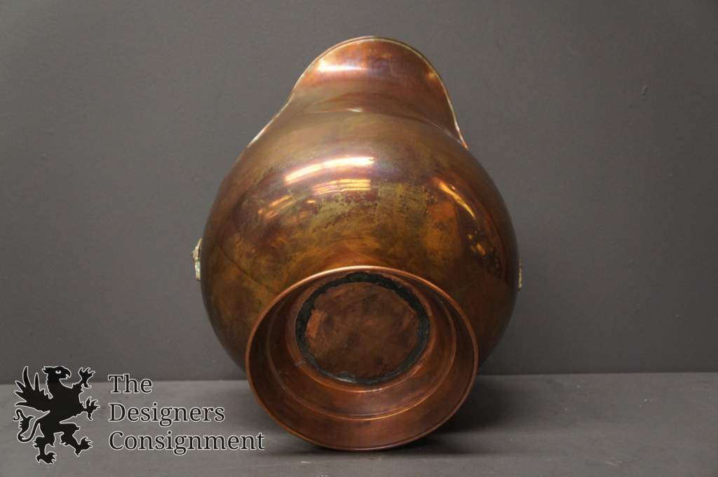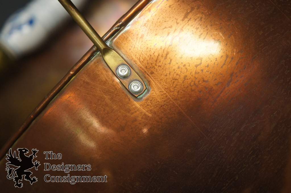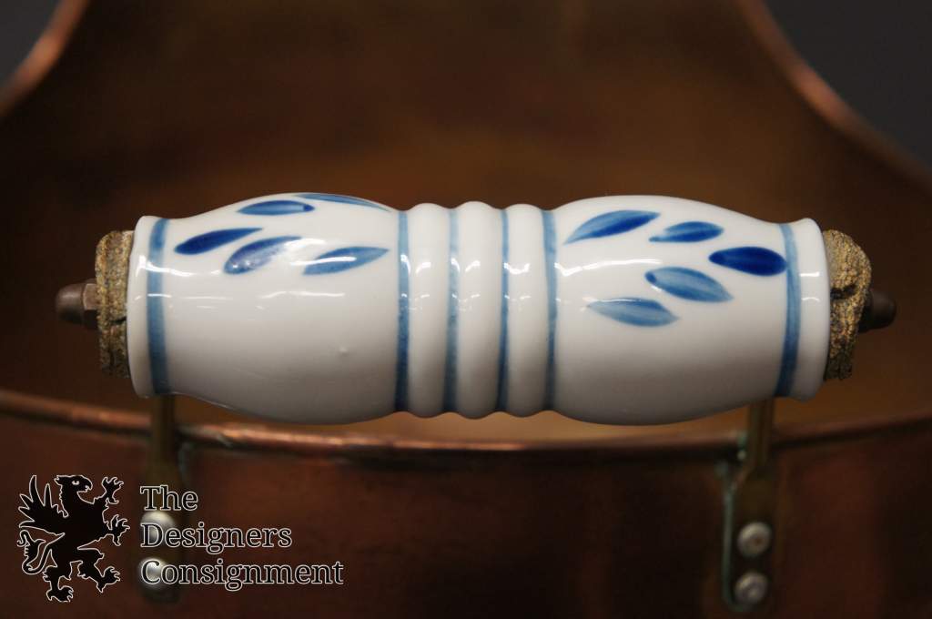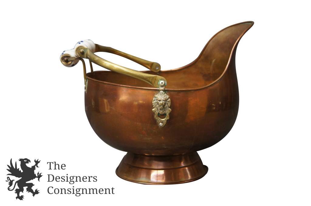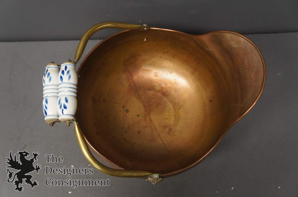 Beautiful copper fireplace coal scuttle bucket. Brass arms with Delft porcelain handles. A great addition to any setting.