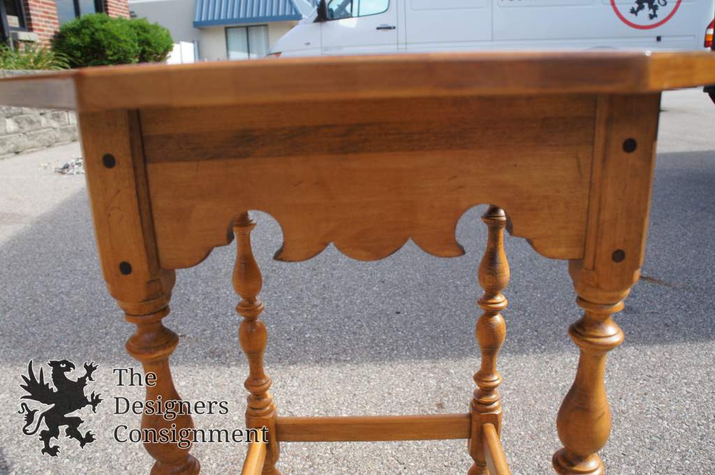 Circa 1776 by Ethan Allen in Maple finish. Features an Octagonal top with spindle legs and a carved apron. 18-8006