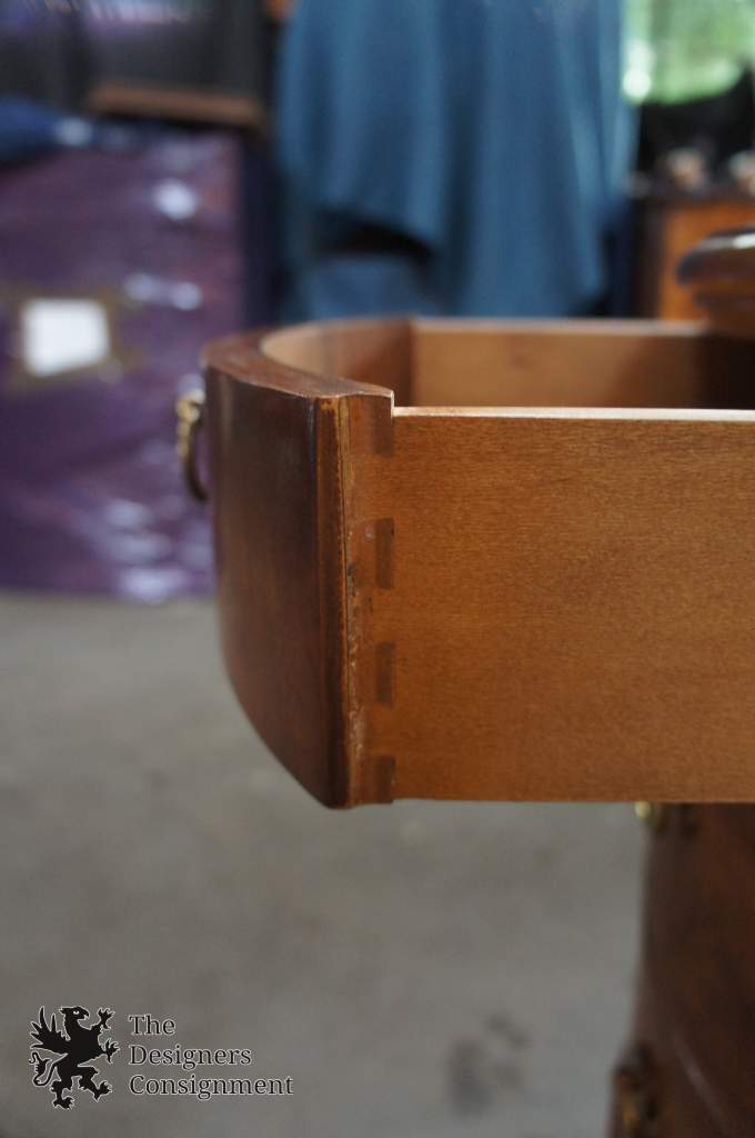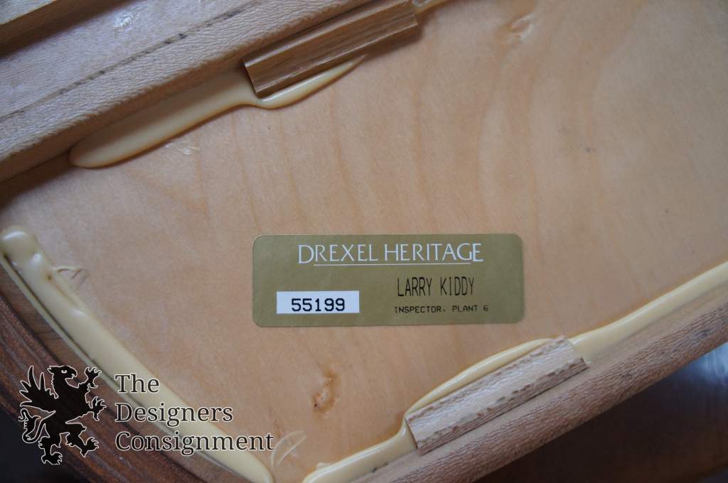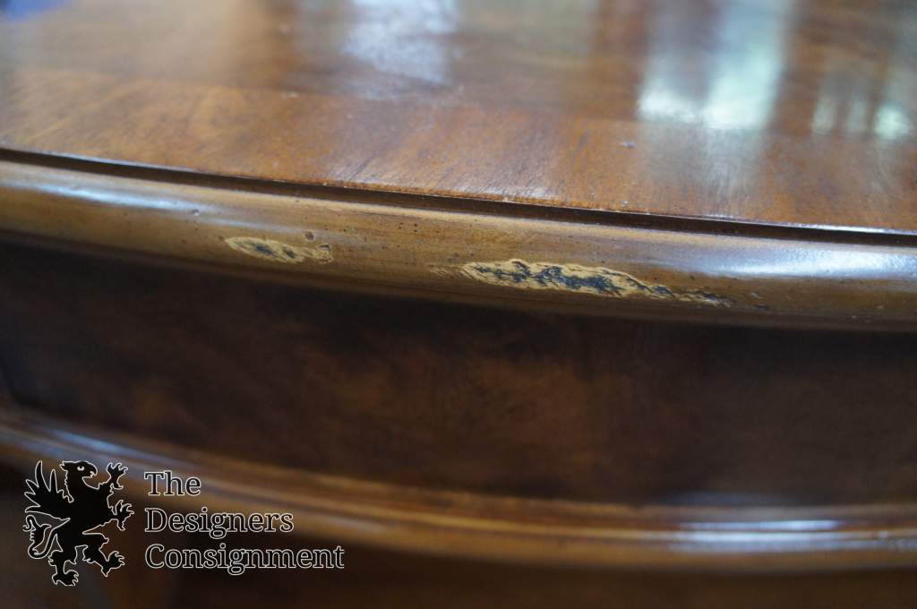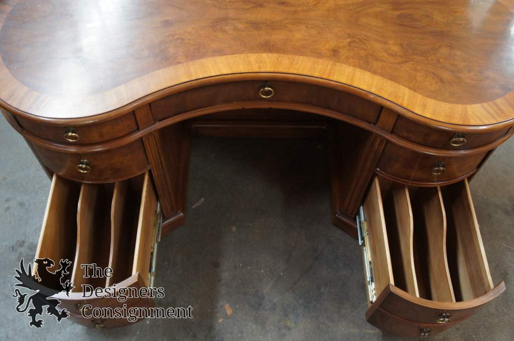 Drexel Heritage kidney bean shaped desk. Features a burled wood top (most likely CarpathianElm) with a lighter tone border, burled apron detailing and drawer fronts. The desk seated side includes two drawers and center pencil drawer along the apron, a box drawer and a double filing drawer with removable dividers on each side of the knee hole. Along the front is a bookcase for display.
