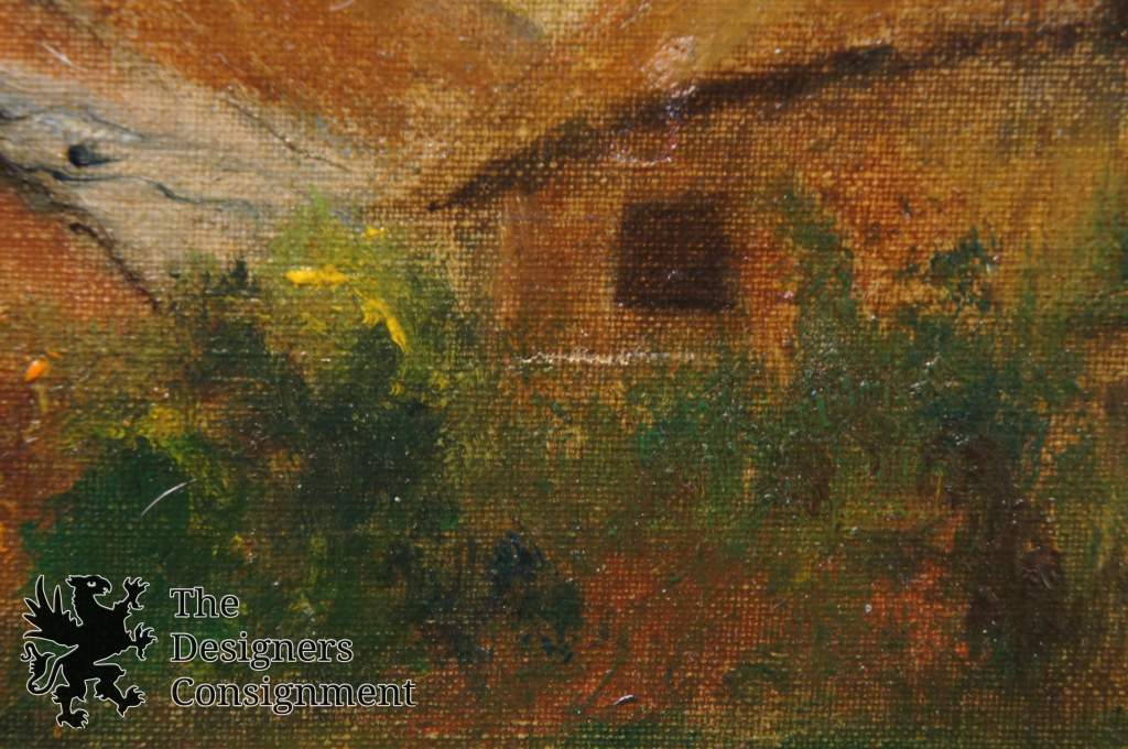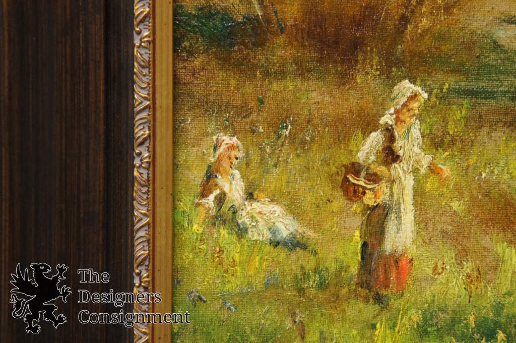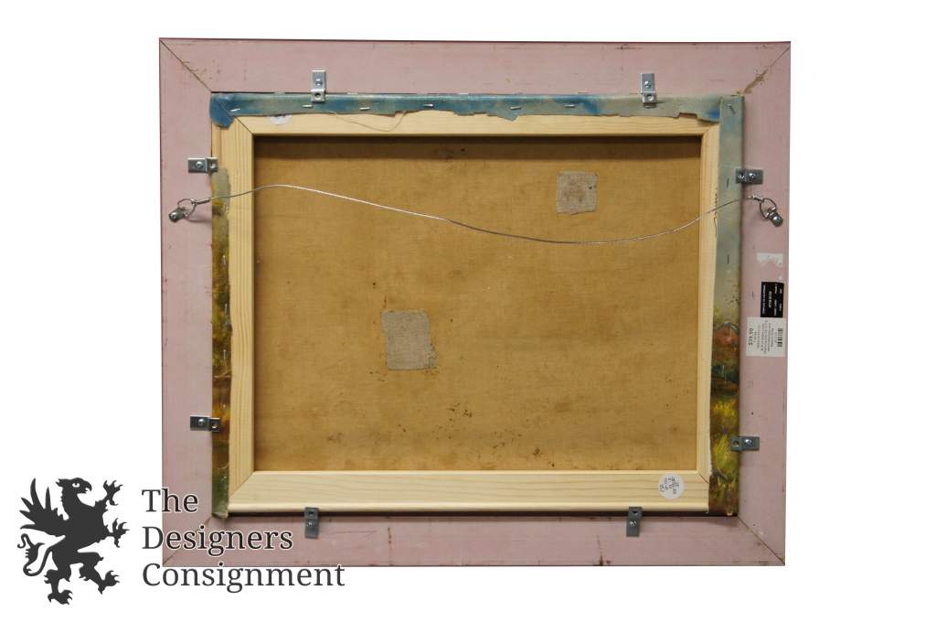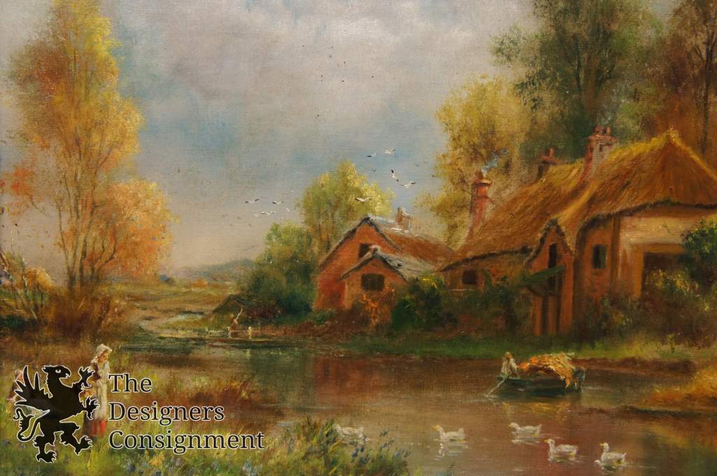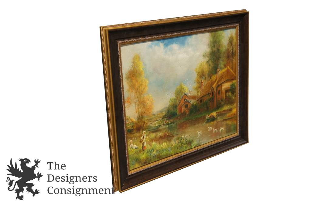 A beautiful oil painting. Appears to beearly20th century on are-stretchedsub frame. Features a farm setting with ducks on the pond.