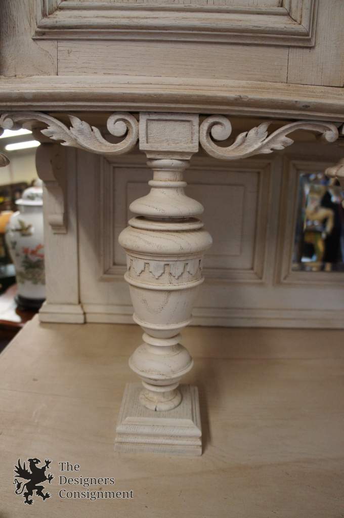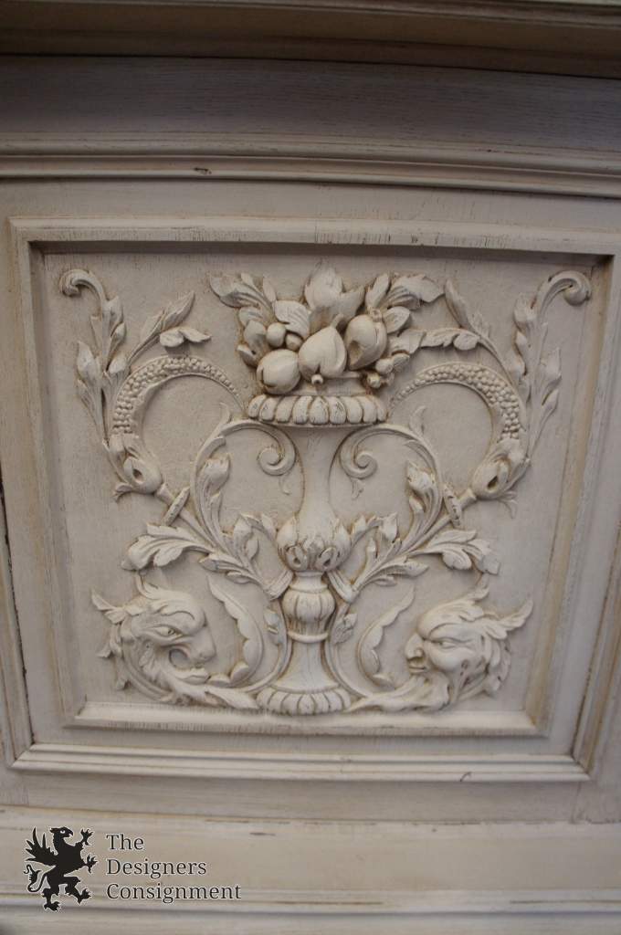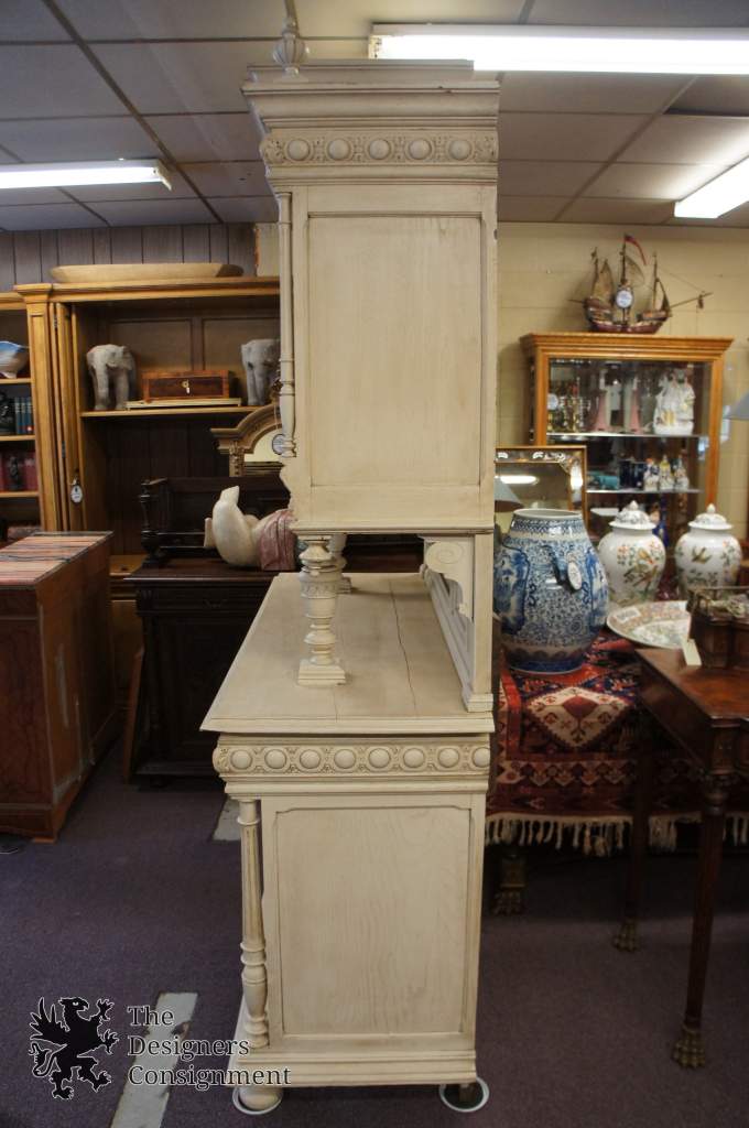 Turn of the century solid oak cupboard finished in white. Heavily carved in high relief with mirrored backsplash. At the center is a Romeo + Juliet scene along the top flanked by 2 wingedserpentson the outer doors. The lower doors feature a floral figural motif. The top steps up with floral trim between two finials. Towards the center you can see that the cabinet supports itself through two urn shaped columns that are each flanked by to drop finials. A magnificent piece that will add character to any space.