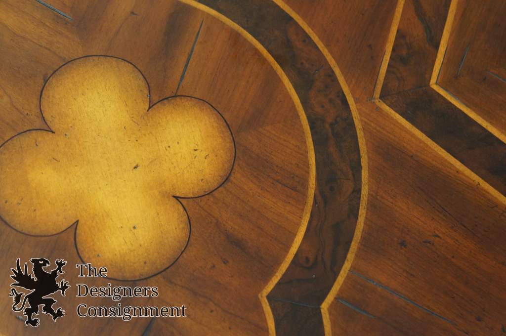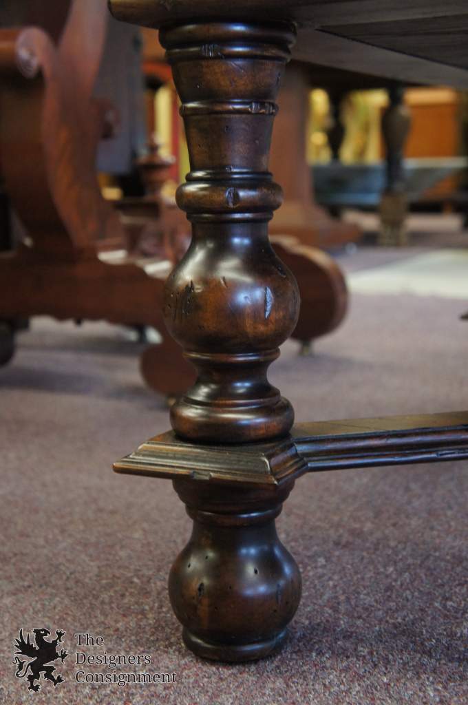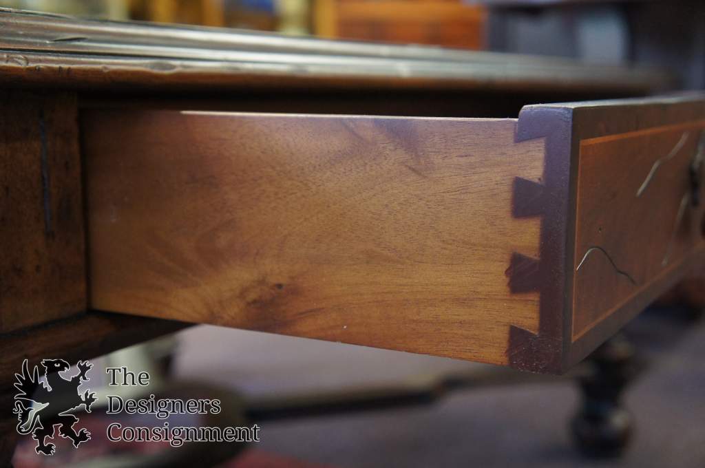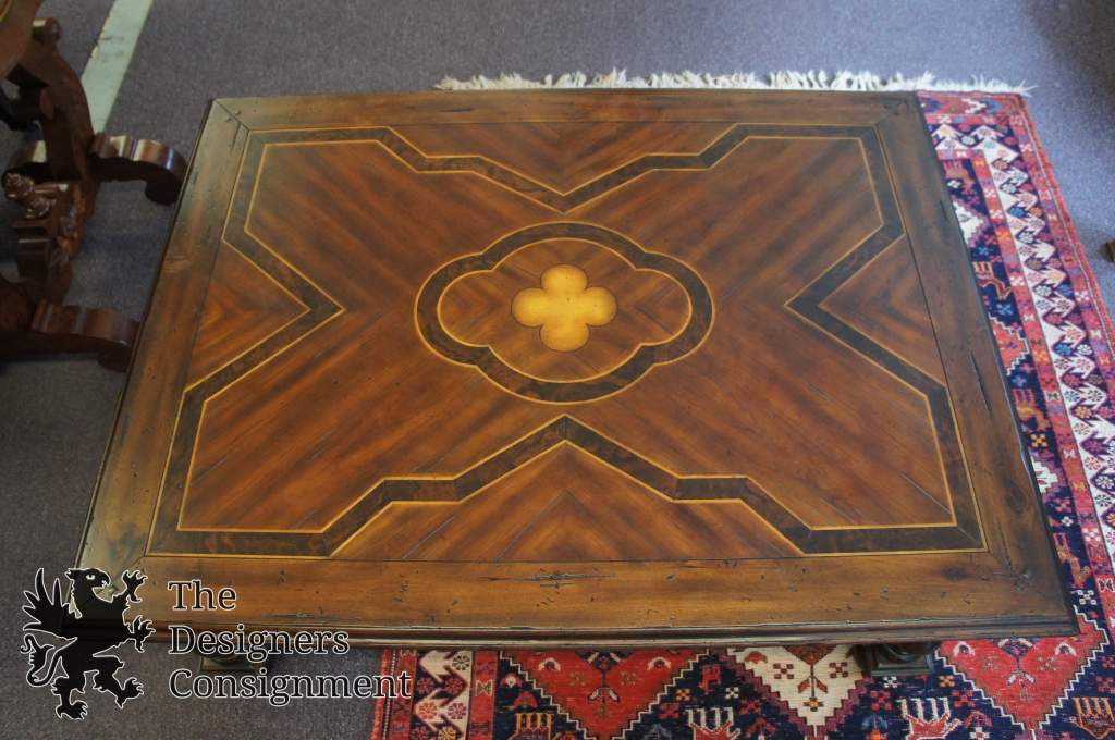 A gorgeous coffee table. Made from mahogany with burled and inlaid accents. Traditional styling with Jacobean influence and brass hardware. Features 3 dovetailed drawers. Will be hand delivered via White Glove Service.