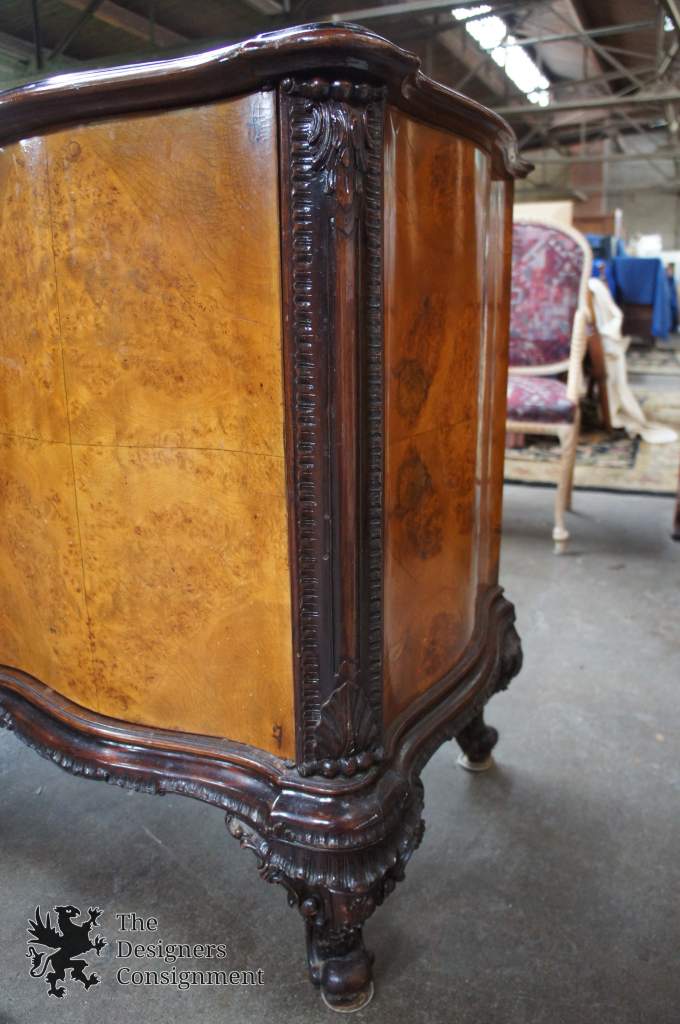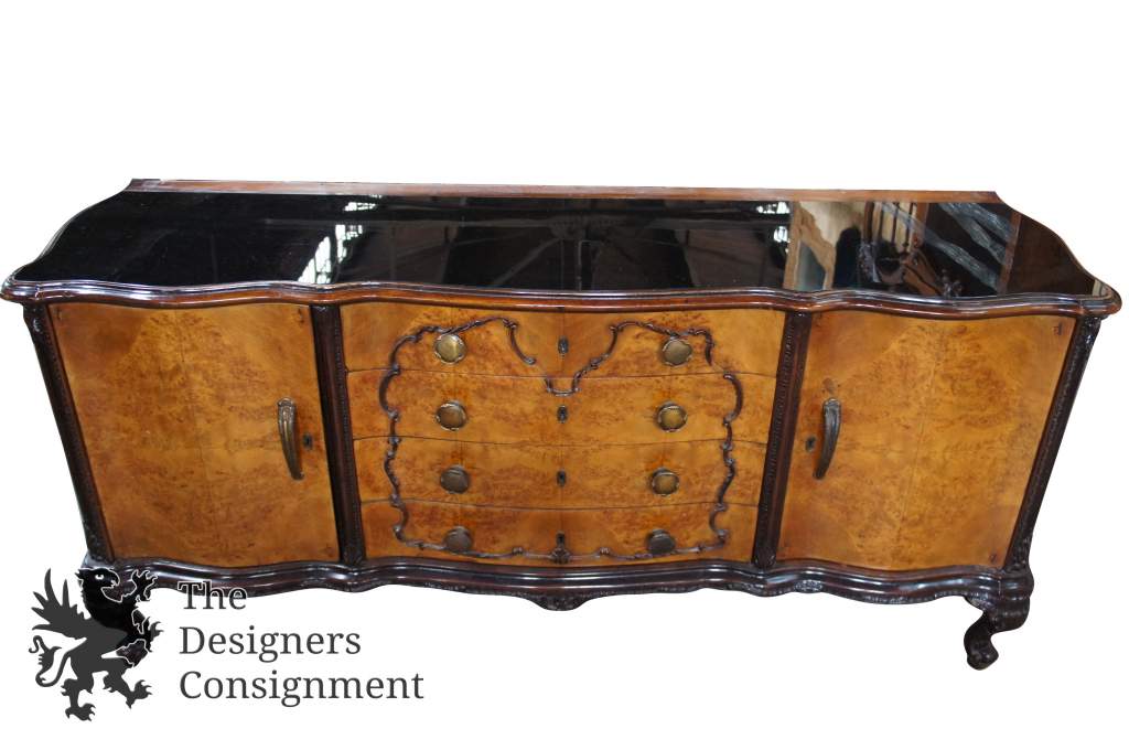 A beautiful Baroque credenza. Made from Carved Mahogany &CarpathianElm. A serpentine front with black glass top. 4 central smooth sliding doors flanked by cabinetdoors. A fantastic addition to any setting. Matching table available if interested.
