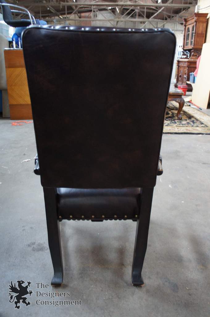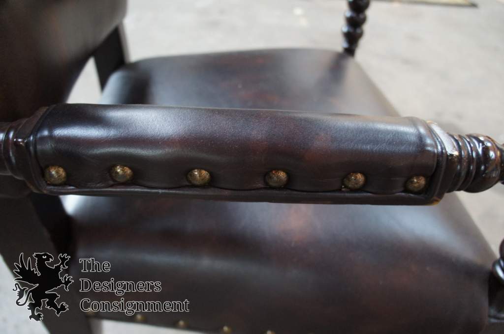 Beautifully contoured chair with dark wood and carved detail. Upholstered in a deep brown leather with nail head trim.