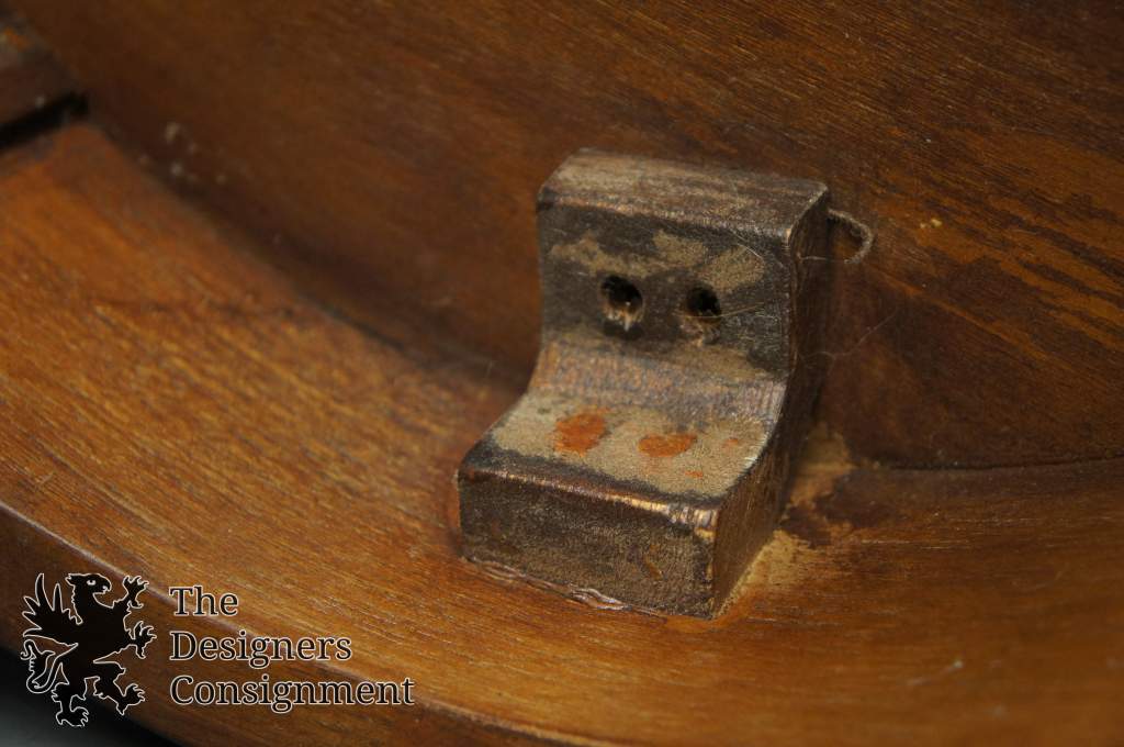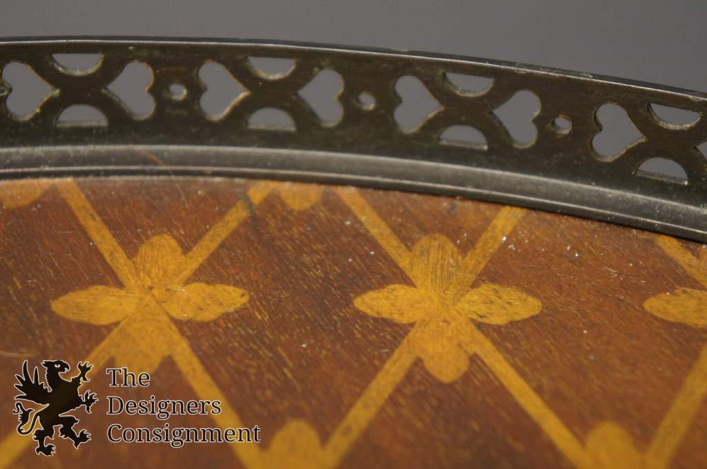 Beautifully designed 2 tier table in a medium wood tone (brown) with gold diamond painted pattern. Each tier features a pierced brass trim. French styling with carved feet.