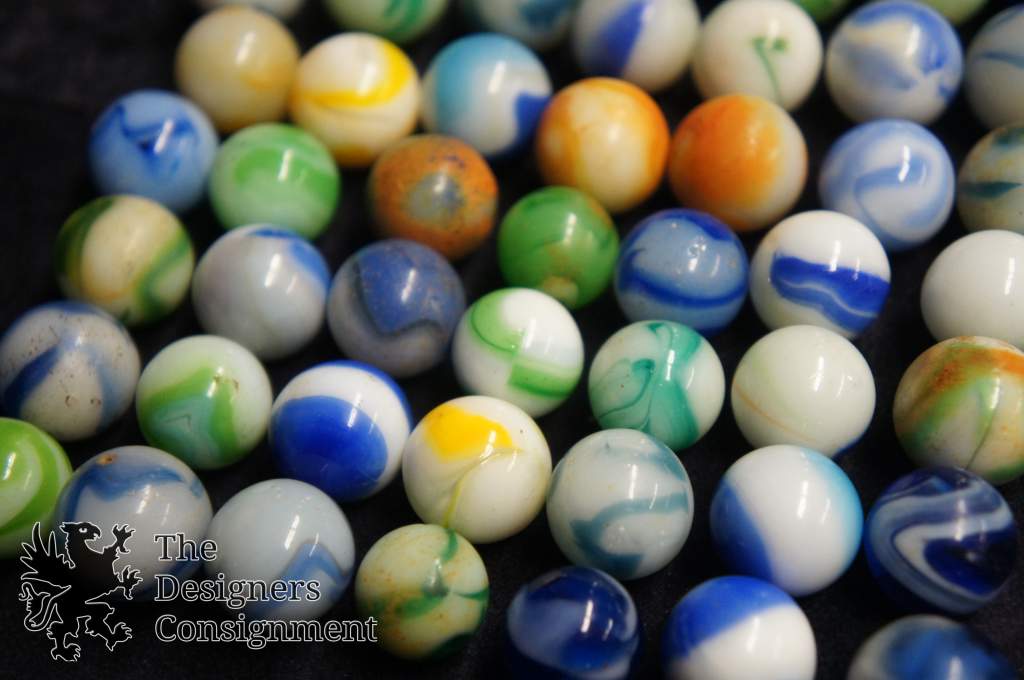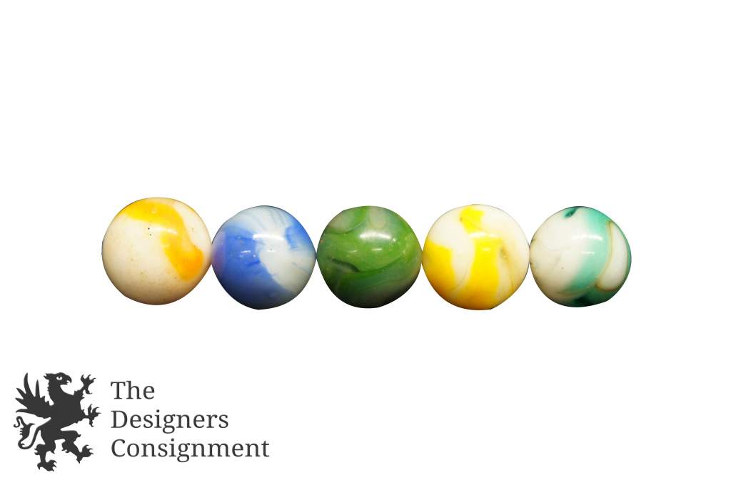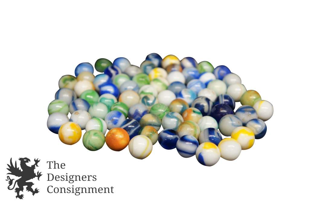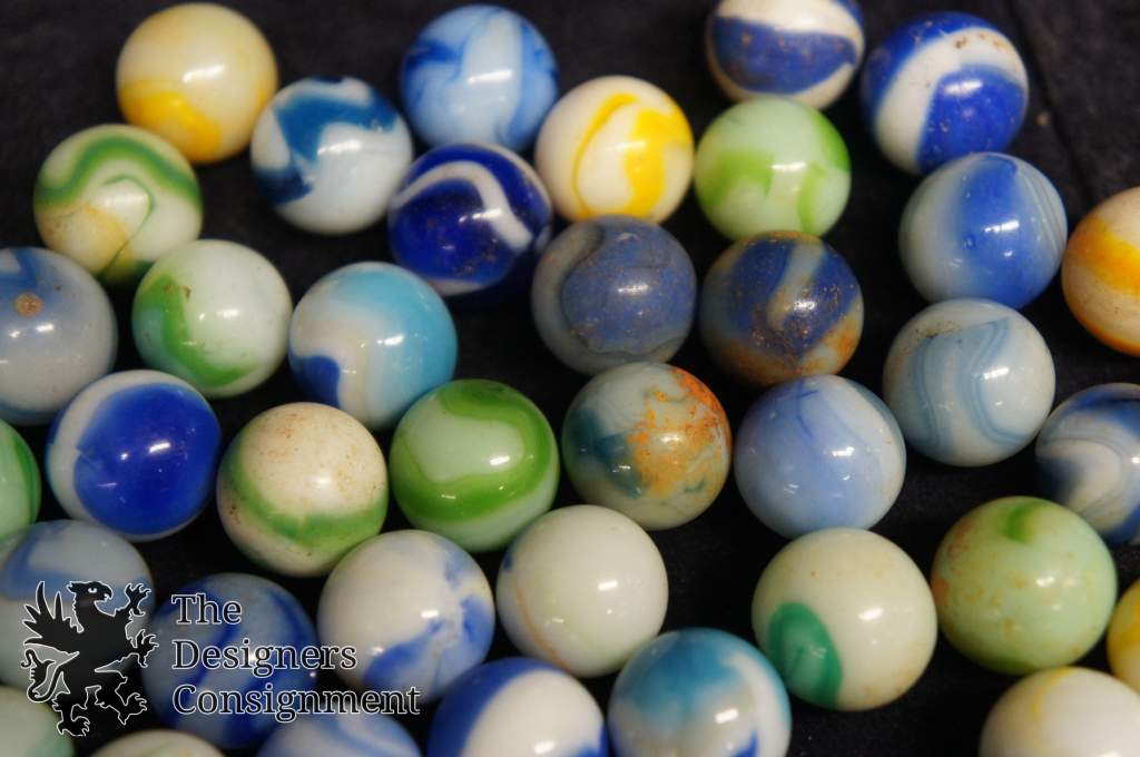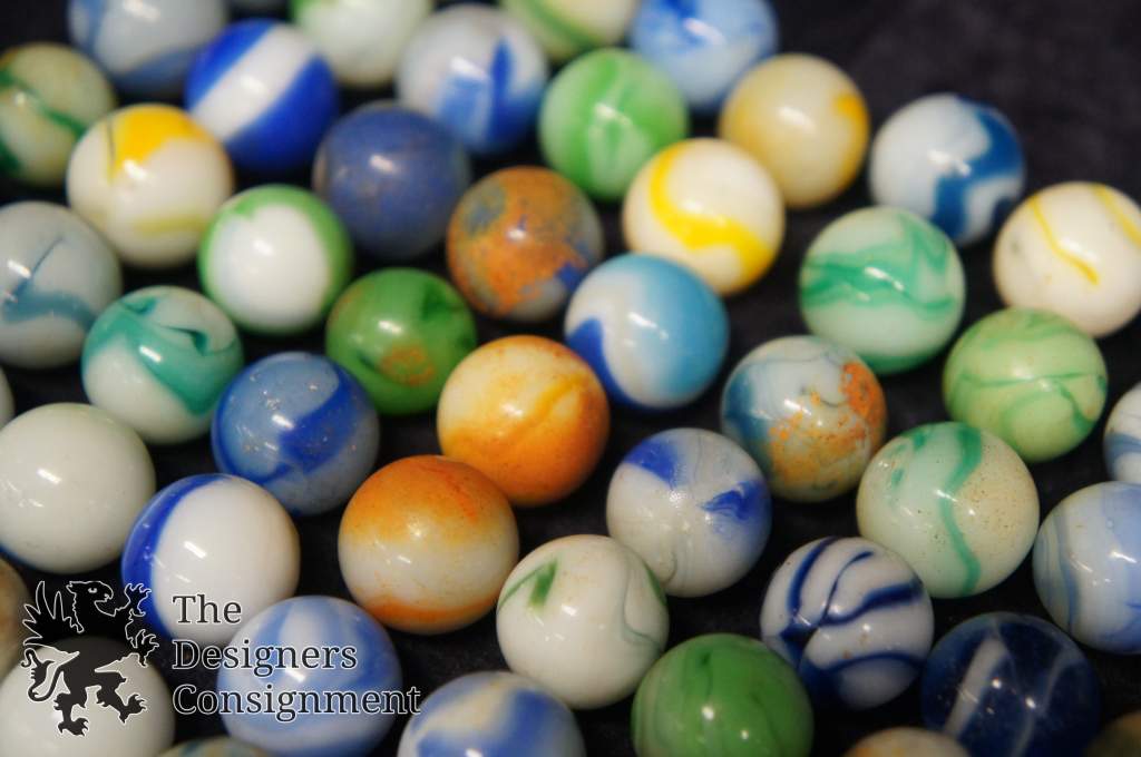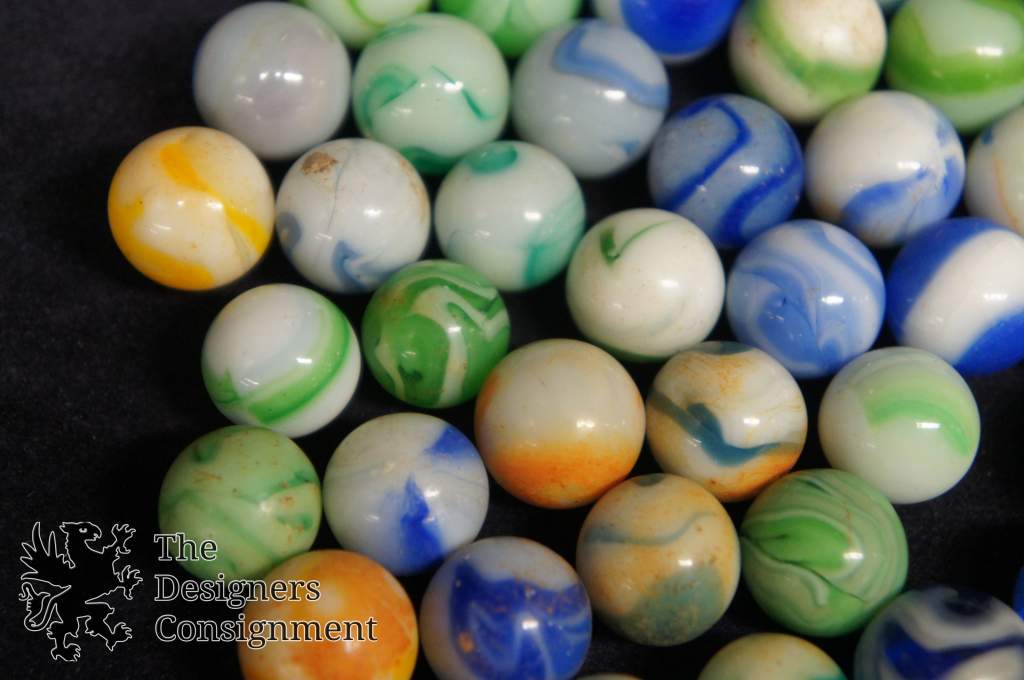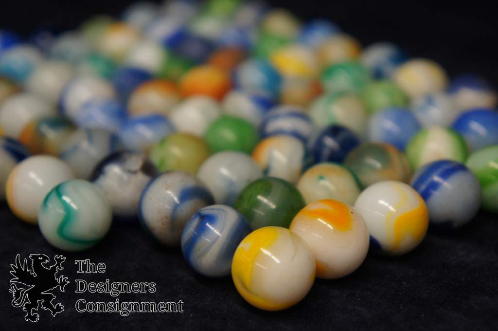 75 Vintage Machine Made Yellow Green Blue White Opaque Swirl Glass Marbles Toys