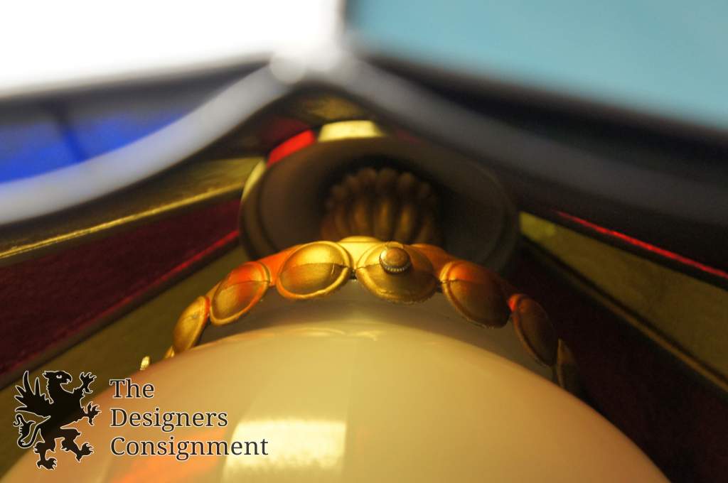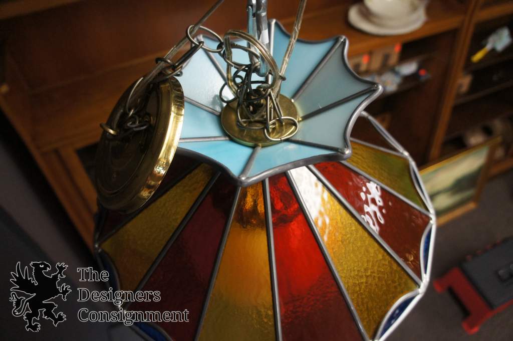 Circa 1960s Lavery & Co Lamp. Theprecursorto Minka Lavery. A beautiful leaded stained glass light. Perfect for use above any pool, bar or breakfast table. Circus themed with red and orange alternating colors along the tent shaped portion of shade.