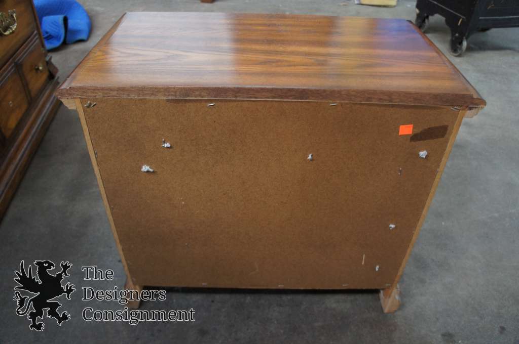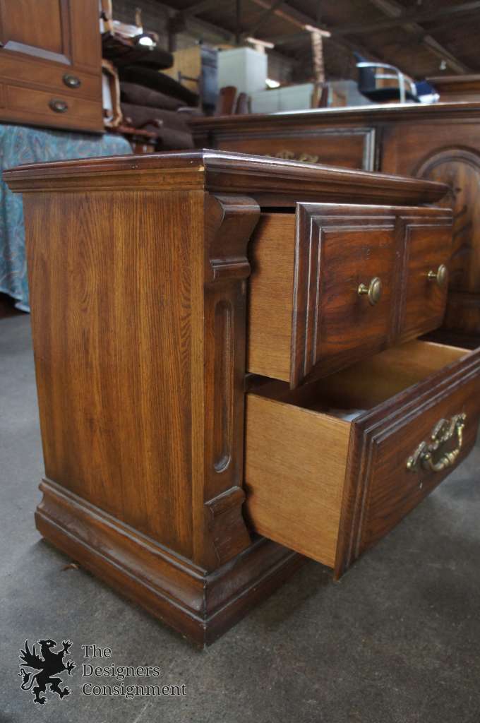 Circa 1980s traditional carved oak end table. Matching bed, and dressers available.